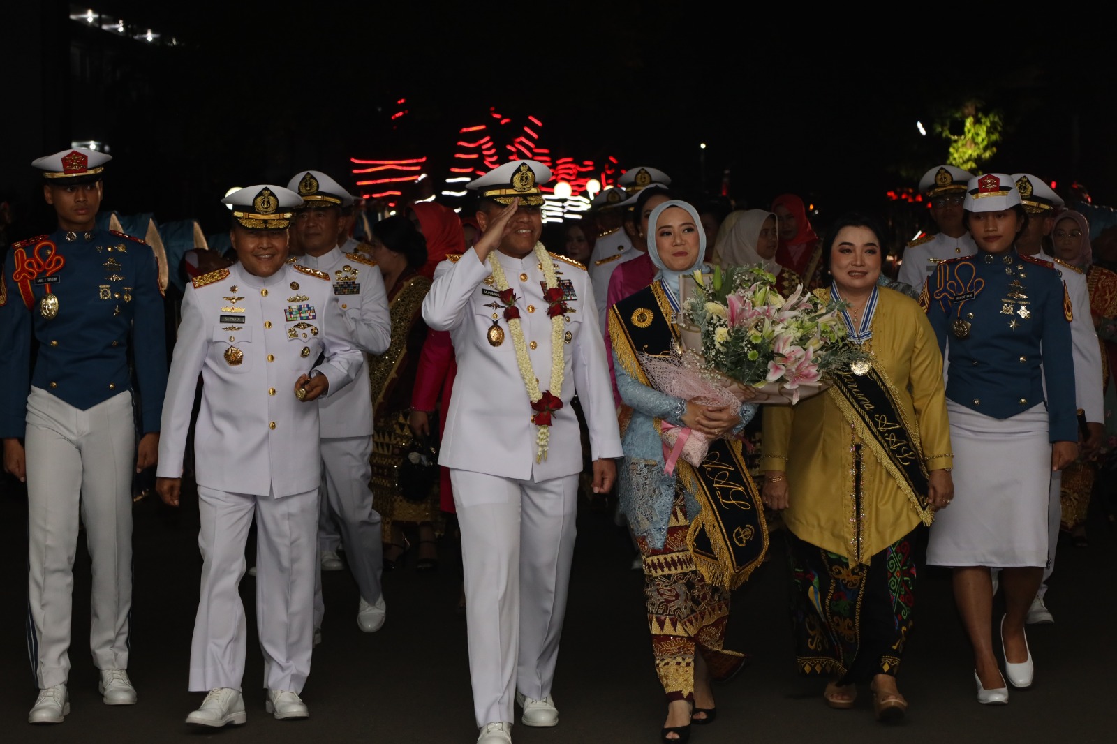Dispen Kormar TNI Angkatan Laut (Surabaya). Komandan Korps Marinir diwakili Wadan Kormar Brigjen TNI (Mar) Suherlan didampingi Wakil Ketua Gabungan Jalasenastri Kormar Ny. Uni Suherlan, menghadiri acara Pengukuhan Tambur Mayor Genderang Suling (GS) Gita Jala Taruna Akademi Angkatan Laut (AAL) oleh Ibu Asuh Taruna AAL Ny. Fera Muhammad Ali yang didampingi oleh Kepala Staf Angkatan Laut (Kasal) Laksamana TNI Dr. Muhammad Ali, S.E., M.M., M.Tr.Opsla., di Lapangan Arafuru, Komplek AAL Bumimoro, Krembangan Surabaya. Kamis malam (04/07/2024).
