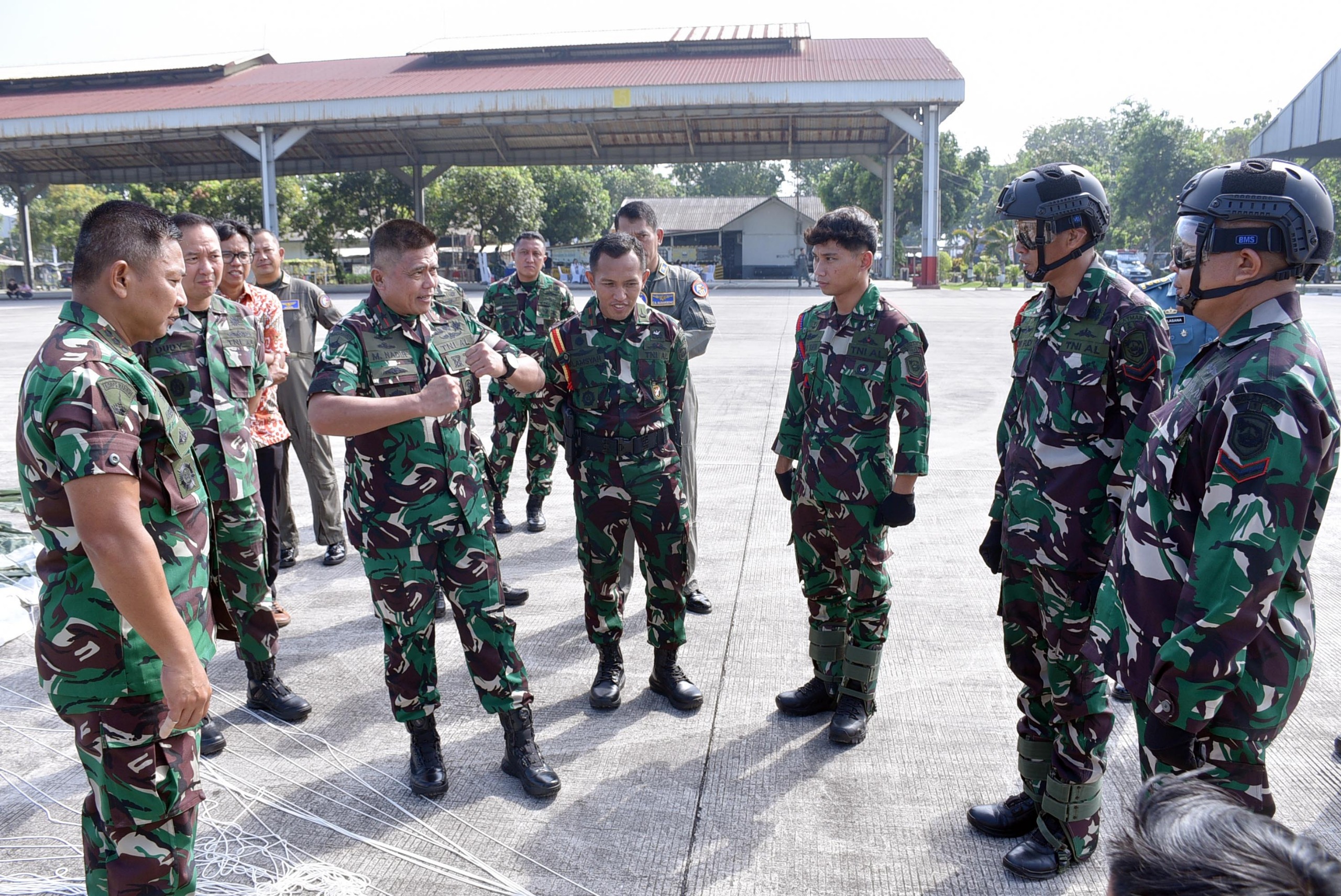 Dispen Kormar TNI Angkatan Laut (Surabaya). Wakil Komandan Korps Marinir, Brigjen TNI (Mar) Muhammad Nadir, M.Tr.Opsla., didampingi Wakil Komandan Pasmar 2, Kolonel Marinir Arief R.H. Anggorojati, S.E., CTMP., M.M., dan Kadismat Kormar Kolonel Marinir Isna Muhsin Abdilah, S.E., M.Tr.Hanla., M.Tr.(Han), meninjau Uji Fungsi Parasut Statik yang dilaksanakan di Hanggar Skuadron Udara 400 Lanudal Juanda, Sidoarjo. Kamis (26/06/2025). Kegiatan ini menjadi salah satu langkah strategis dalam menjamin kesiapan alat utama pendukung operasi lintas udara TNI AL.