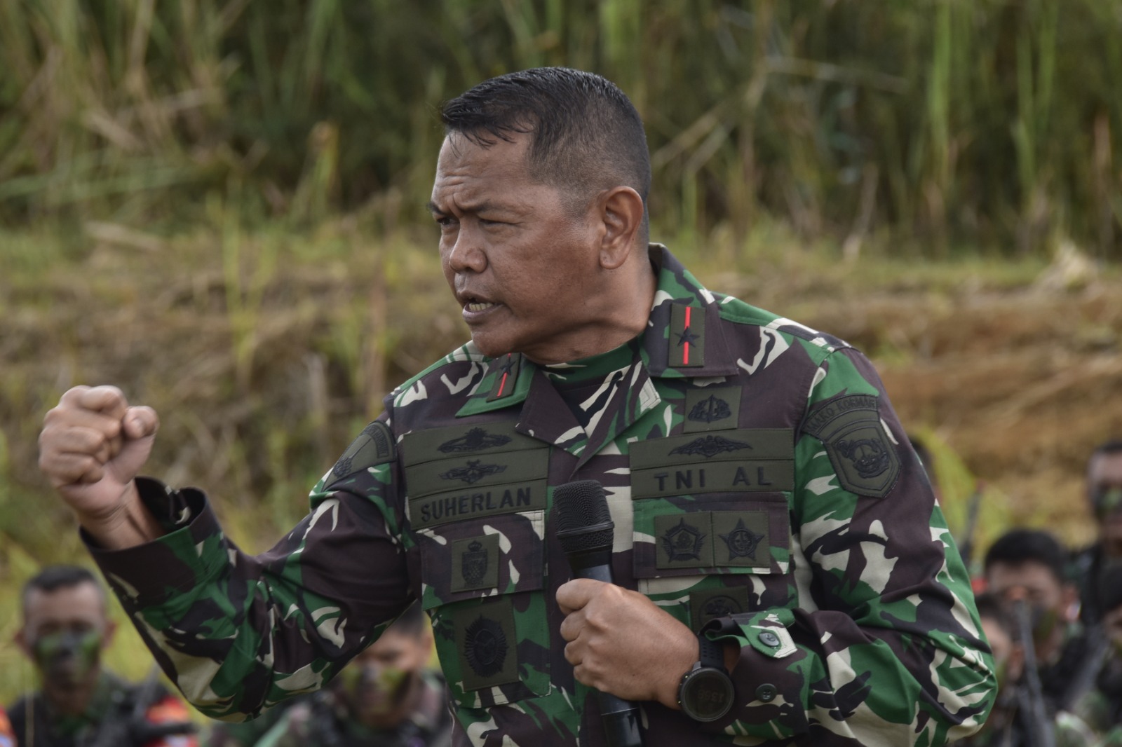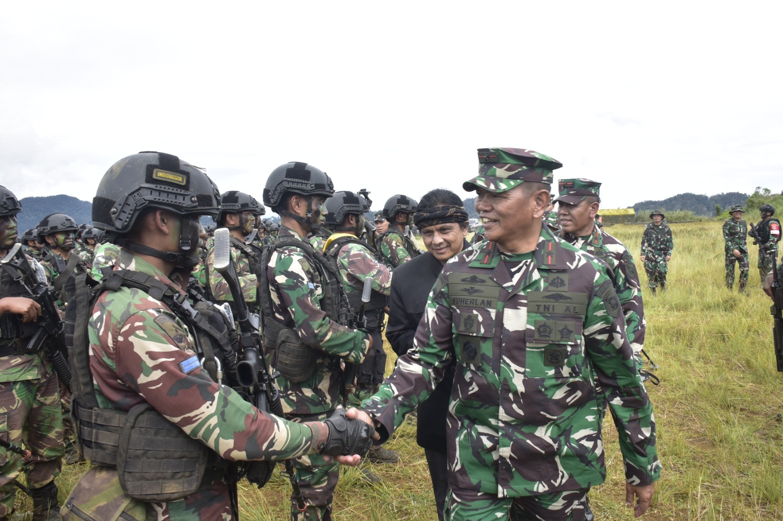 Dispen Kormar, TNI Angkatan Laut (Jakarta). Wakil Komandan Korps Marinir (Wadan Kormar) Brigjen TNI (Mar) Suherlan  meninjau Prajurit Petarung Korps Marinir TNI Angkatan Laut yang sedang melaksanakan Latihan Pratugas Satgas Pamtas Mobile yang digelar di Gunung Halimun, Citalahab Jawa Barat. Minggu (10/03/2024).