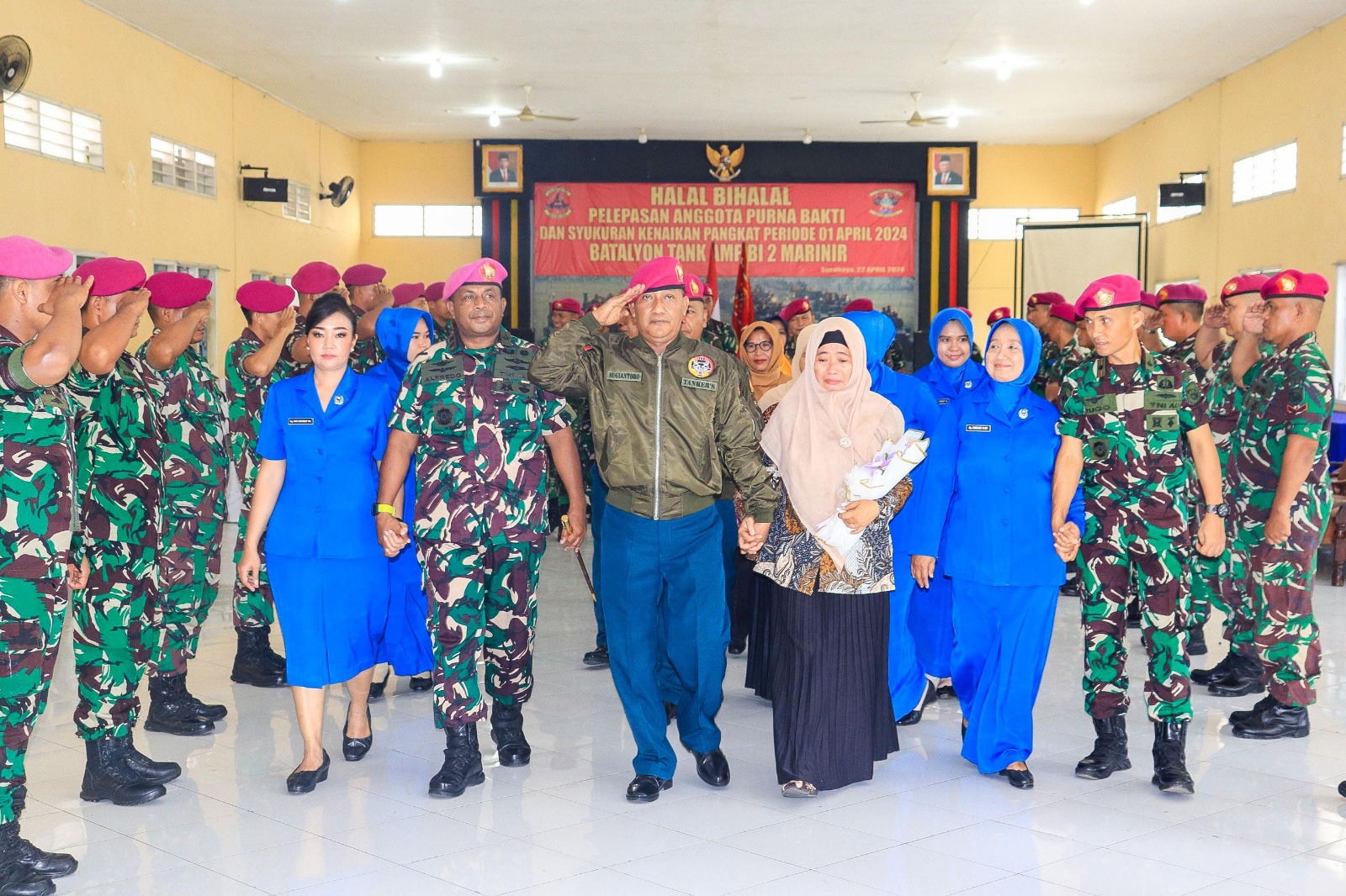 TNI AL.Dispen Kormar(Surabaya), Dalam rangka tasyakuran prajurit yang naik pangkat dan apresiasi setinggi-tingginya atas loyalitas serta pengabdian prajurit yang memasuki masa purna kepada satuan. Batalyon Tank Amfibi 2 Marinir melaksanakan acara tasyakuran kenaikan pangkat periode 1 April tahun 2024 dan tradisi pelepasan anggota purnabakti yang dikemas dalam rangkaian kegiatan Halal Bihalal bertempat di Gedung Serbaguna Batalyon Tank Amfibi 2 Marinir Kesatrian Marinir Sutedi Senaputra Karangpilang, Surabaya. Senin (22/04/2024).