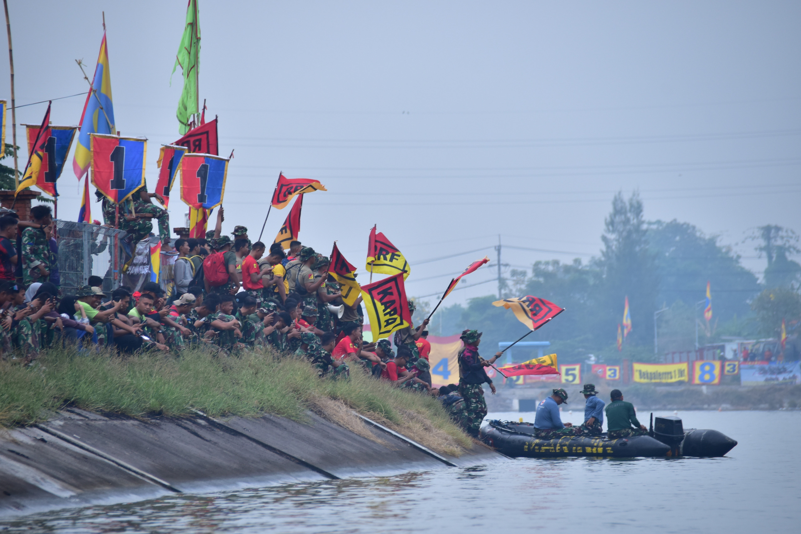 Nampak masyarakat yang menyaksikan berjalannya lomba memberikan dukungannya kepada para Kesatria Baret ungu yang bejuang menjadi yang tercepat dalam Lomba Dayung 1000 meter.
