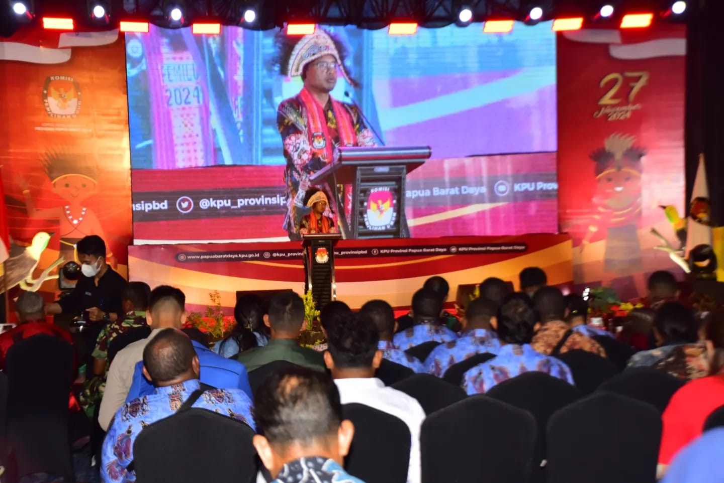 TNI AL, Dispen Kormar Sorong. Asintel Danpasmar 3 Kolonel Mar Ernst Rikumahu, CRMP., menghadiri Peluncuran Tahapan Pemilihan Kepala Daerah Gubernur dan Wakil Gubernur Provinsi Papua Barat Daya di Aston Sorong Hotel and Conference Center, Jl. Basuki Rahmat, Km. 8, Kel. Malaingkedi, Kota Sorong, Papua Barat Daya. Jumat (03/05/2024).
