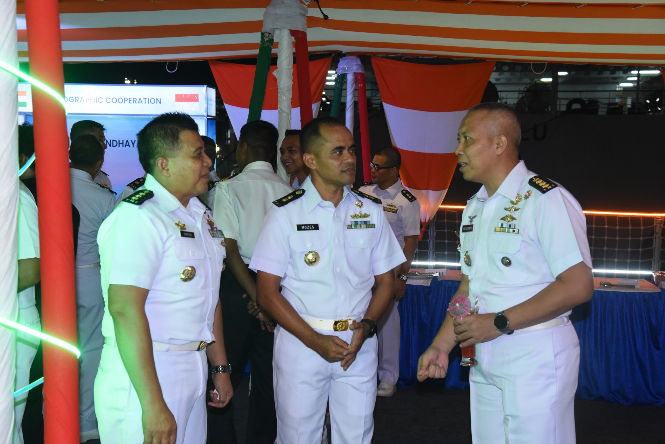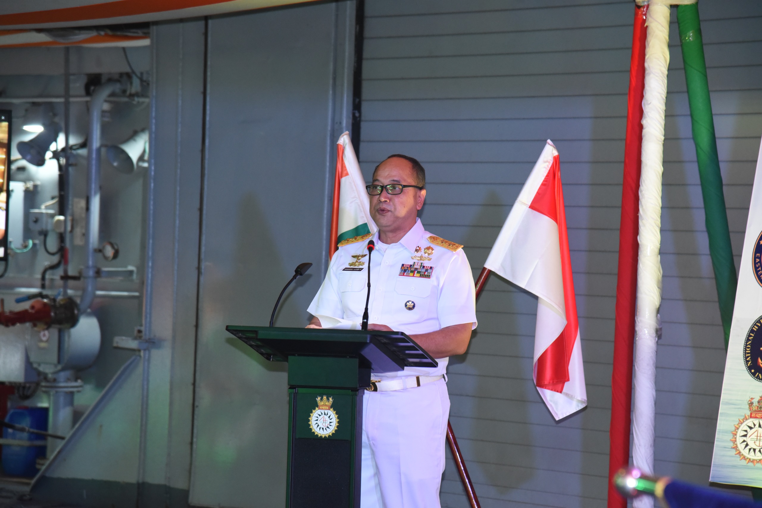 Dispen Kormar TNI Angkatan Laut (Jakarta). Komandan Korps Marinir Mayor Jenderal TNI (Mar) Dr. Endi Supardi, S.E., M.M., M.Tr.Opsla., CHRMP., CRMP., diwakili Askomlek Dankormar Kolonel Marinir Didiet Hendra Wijaya, M.Mp., dan Wakil Komandan Korps marinir Brigadir Jenderal TNI (Mar) Muhammad Nadir, M.Tr.Opsla., diwakili Kadis Komplek Letkol Mar Ade Lesmono, M.Tr.Opsla., menghadiri undangan Dubes India untuk Indonesia Deck Reception onboard the Ship atau makan malam di atas kapal perang India dalam rangka Kunjungan Kapal Perang INS Sandhayak di Dermaga 107, Tanjung Priok, Jakarta Utara. Rabu (23/07/2025).