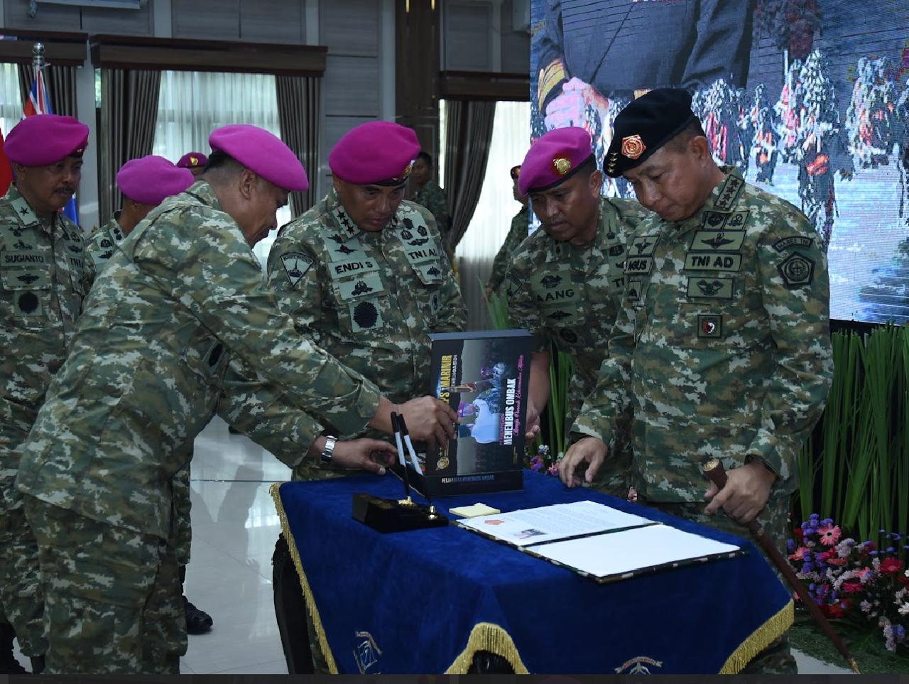 Sementara itu, Panglima TNI Jenderal TNI Agus Subiyanto, S.E., M.Si. dalam tulisan serupa menyampaikan rasa bangganya terhadap pasukan Korps Marinir yang dikenal loyal dan berdedikasi tinggi. âTegakkan NKRI sampai titik darah penghabisan,â tulisnya tegas. Hadir dalam kegiatan tersebut sejumlah Pejabat Utama Mabes TNI, Delegasi High Level Committee (HLC), perwakilan Kedutaan Besar Australia serta Pejabat Utama Korps Marinir