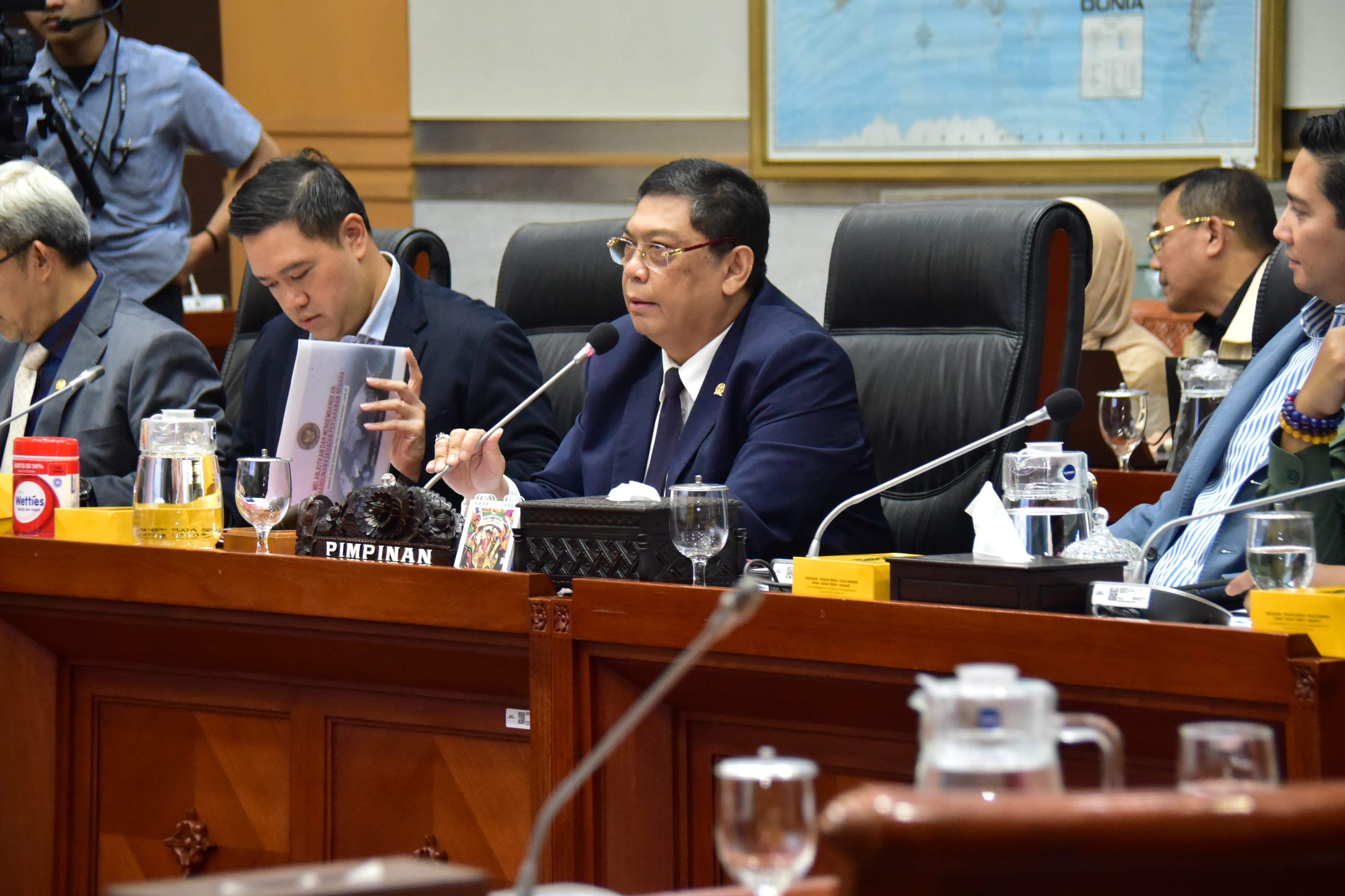 Rapat kerja komisi I DPR RI dengan menteri Pertahanan RI dan Panglima TNI serta Kepala Staf AD, Kepala Staf AL dan Kepala Staf AU untuk membahas program kerja serta persiapan keamanan Pilkada serentak 2024 dan membahas hal-hal lain yang dipimpin ketua Komisi I DPR RI Utut Adianto.
