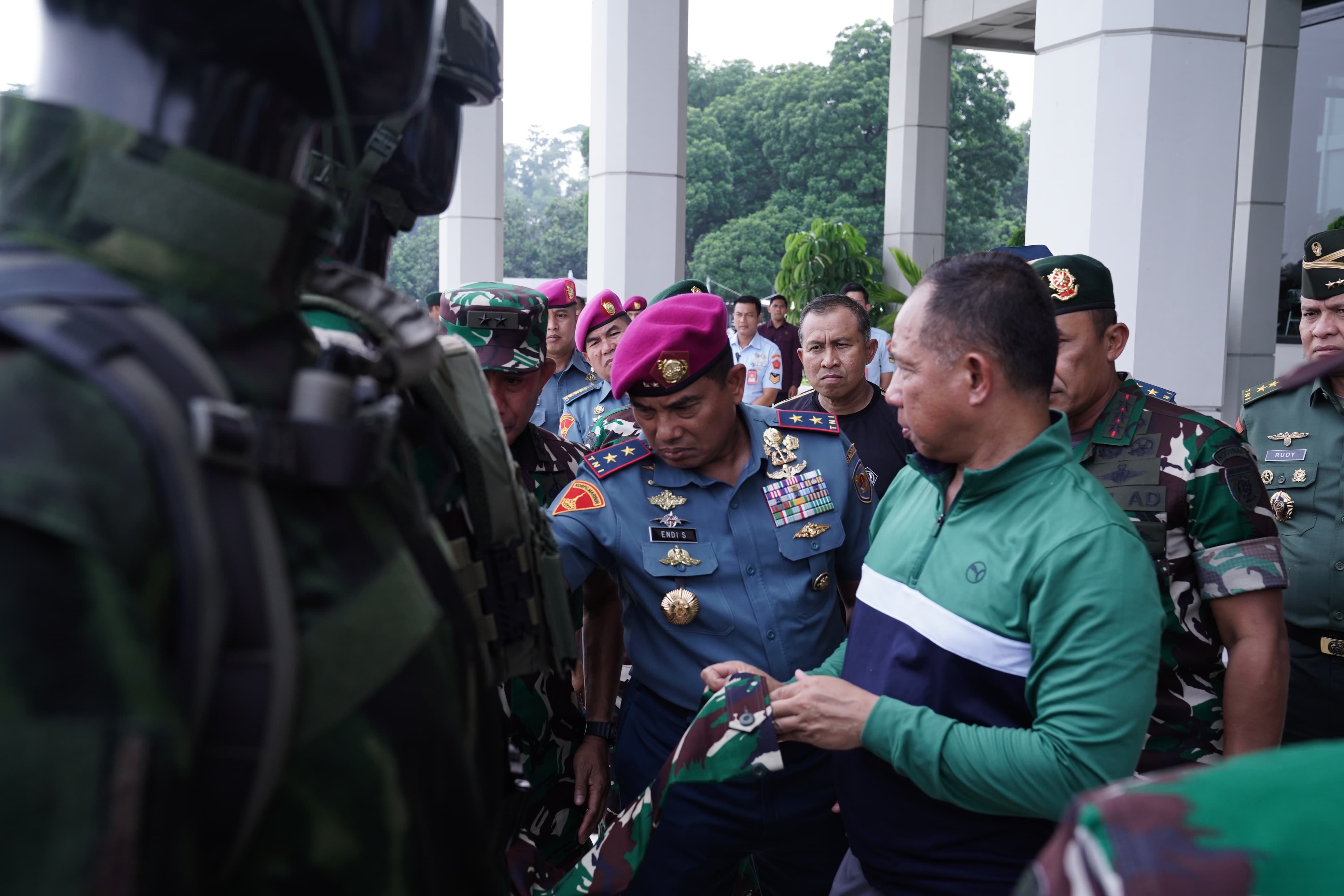 Dispen Kormar TNI Angkatan Laut (Jakarta). Komandan Korps Marinir (Dankormar) Mayor Jenderal TNI (Mar) Dr. Endi Supardi., S.E., M.M., M.Tr.Opsla., CHRMP., CRMP. mendampingi Panglima TNI Jenderal TNI Agus Subiyanto, S.E., M.Si. meninjau gelar bekal Kelengkapan Perorangan Lapangan (Kaporlap) dan Kelengkapan Satuan dan Lapangan (Kapsatlap) untuk Satuan Tugas (Satgas) Operasi Dalam Negeri TA 2025, bertempat di Plaza Mabes TNI, Cilangkap, Jakarta Timur, Rabu (30/10/2024).