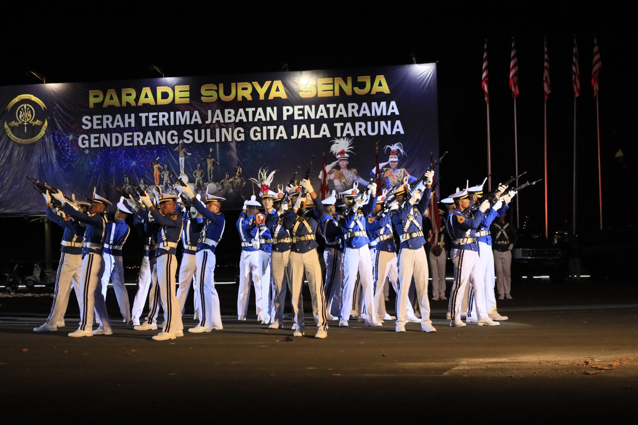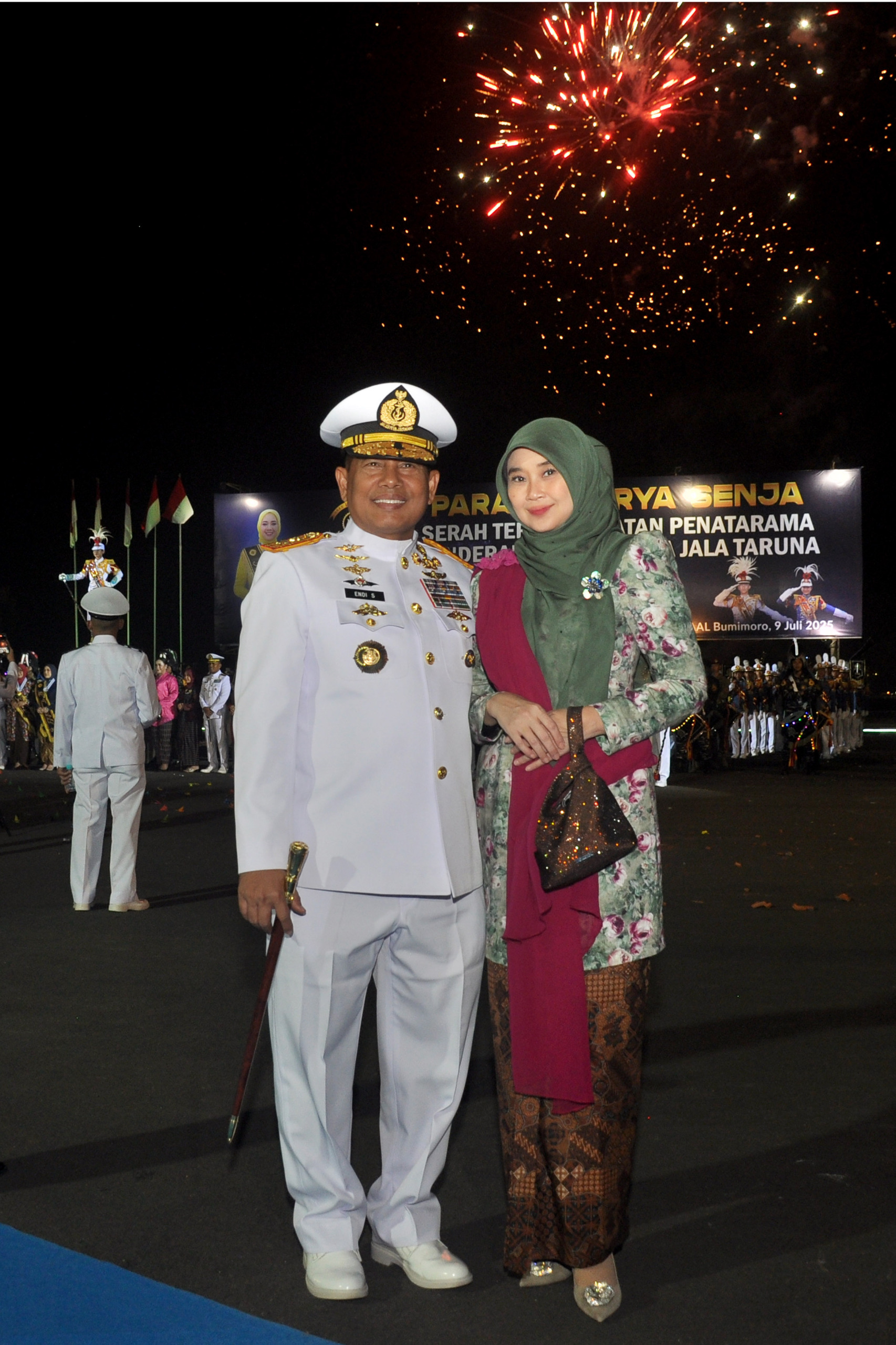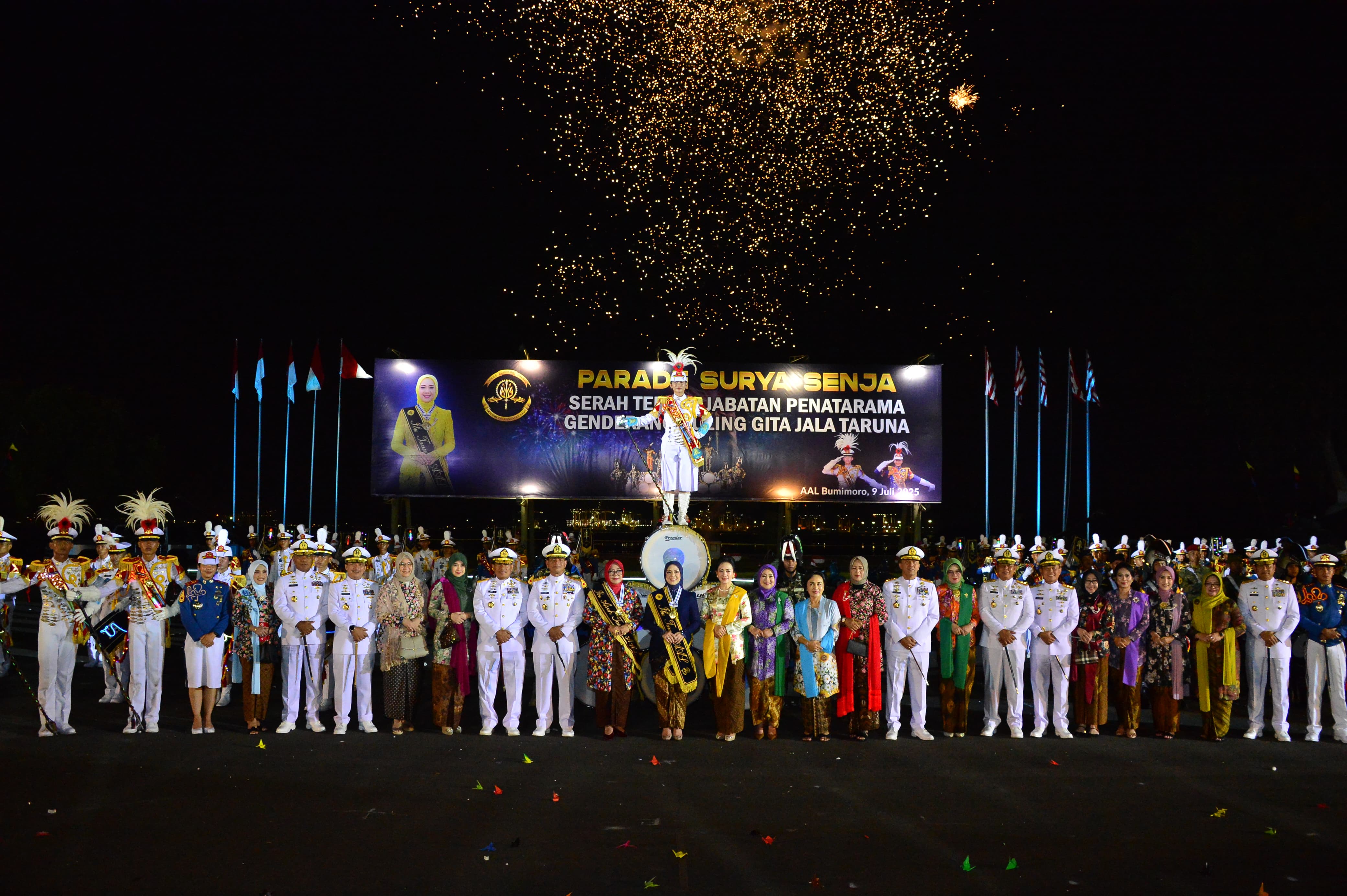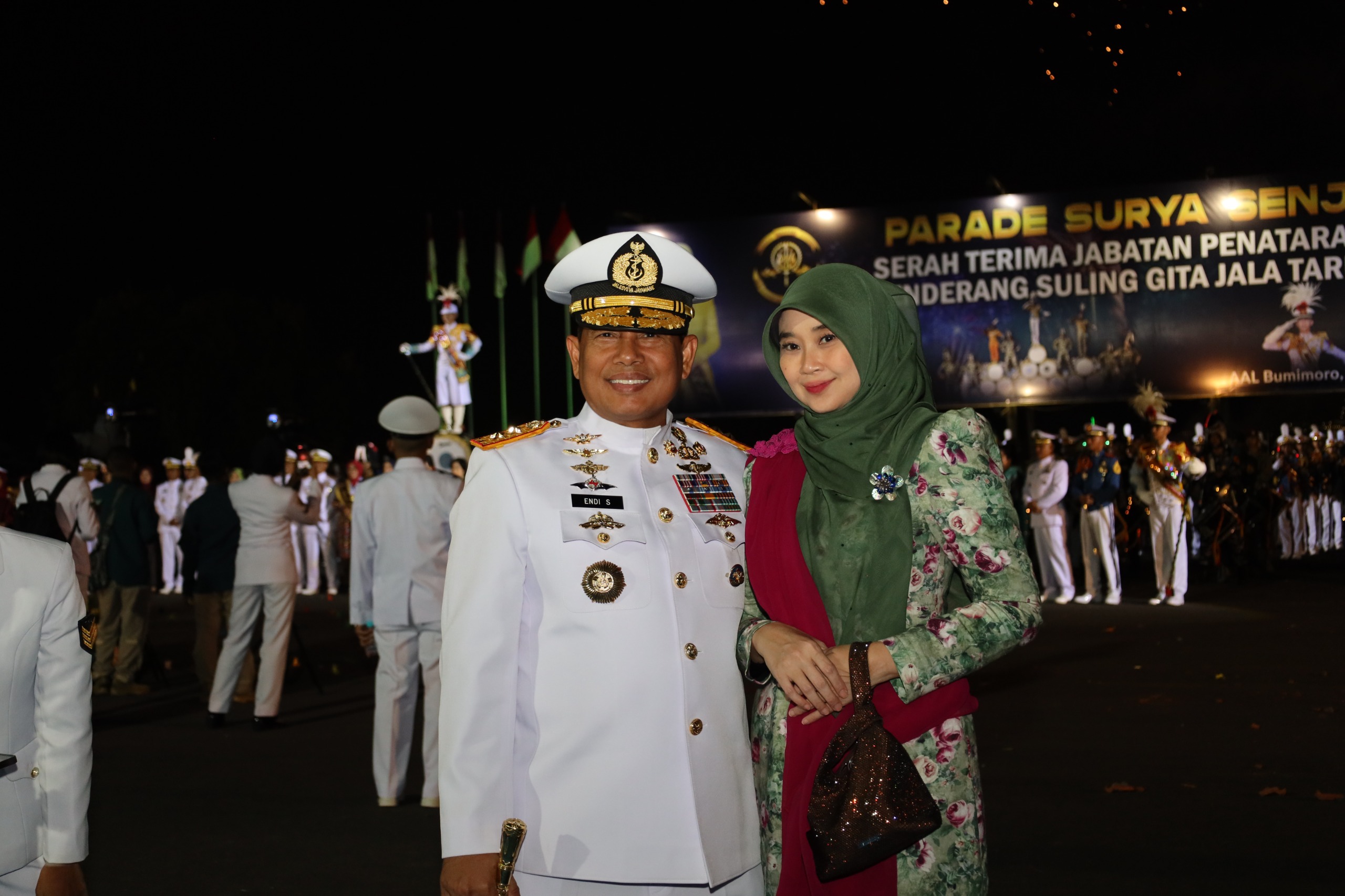 Dispen Kormar TNI Angkatan Laut (Surabaya). Komandan Korps Marinir (Dankormar) Mayor Jenderal TNI (Mar) Dr. Endi Supardi, S.E., M.M., M.Tr.Opsla., CHRMP., CRMP., didampingi Ketua Gabungan Jalasenastri Korps Marinir, Ny. Nana Endi Supardi, menghadiri Tradisi Parade Surya Senja Taruna Akademi Angkatan Laut (AAL) di Lapangan Arafuru, Bumimoro, Surabaya, Rabu malam (09/07/2025).