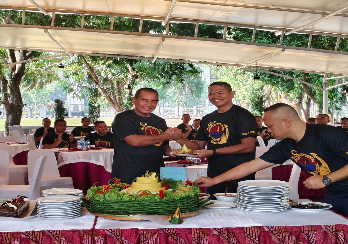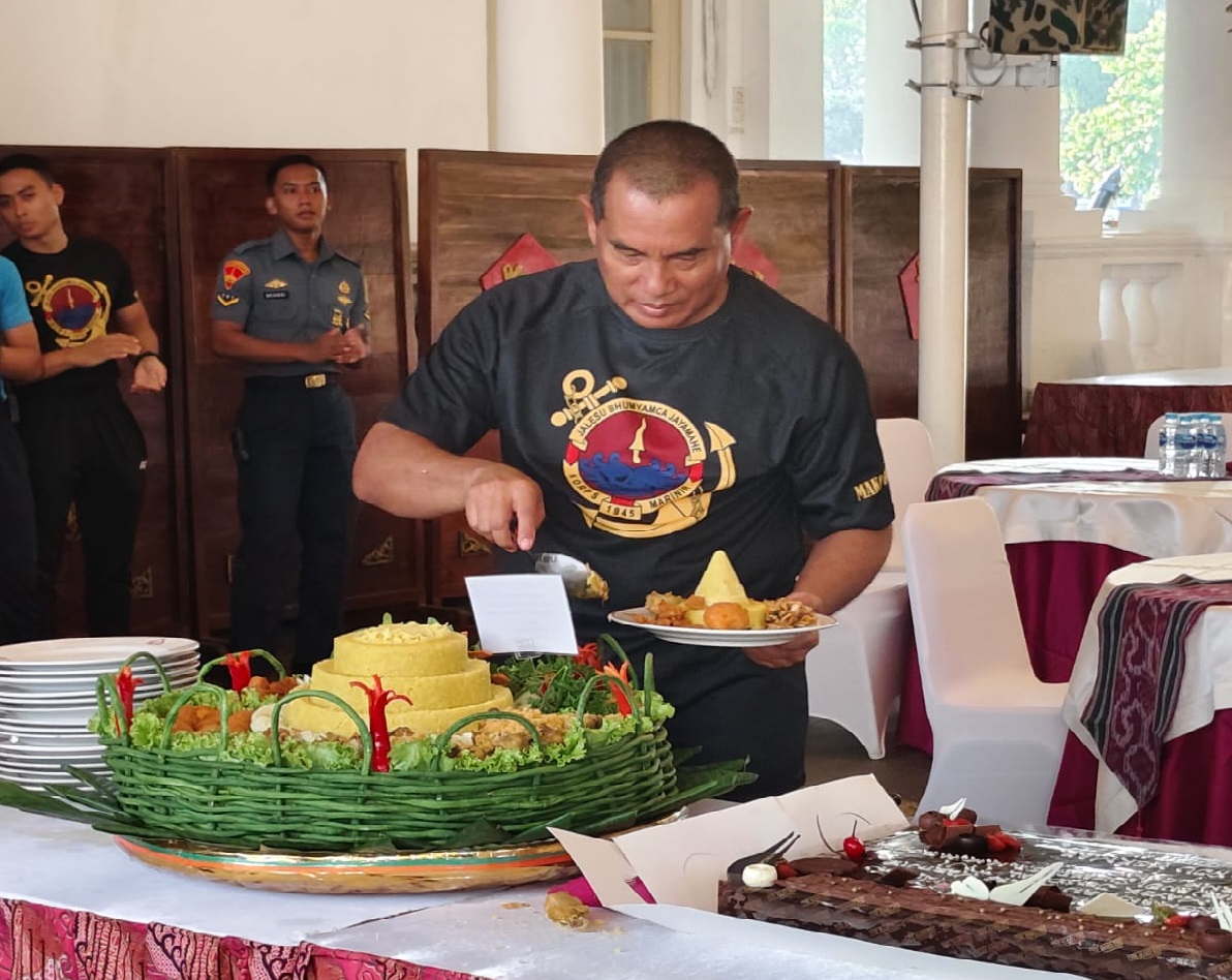 Acara dilanjutkan dengan doa dan potong tumpeng kemudian makan tumpeng bersama prajurit Marinir.