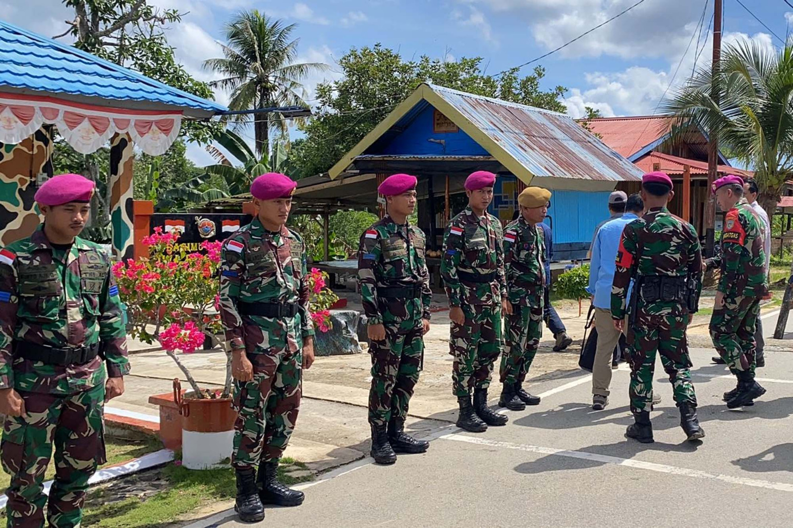 TNI AL, Dispen Kormar (Nunukan). Komandan Satgasmar Pam Ambalat XXIX Lettu Mar Presly Brisky Musak, S.,T mendampingi Direktur C Bais Mabes TNI Brigjen TNI Mirza Patria Jaya, S.E., M.Tr(Han) dalam rangka kunjungan kerja ke Pulau Sebatik di Pos Lintas Batas Negara (PLBN) Desa Sei Pancang, Kec. Sebatik Utara, Kab. Nunukan, Kalimantan Utara. Rabu (24/04/2024).
