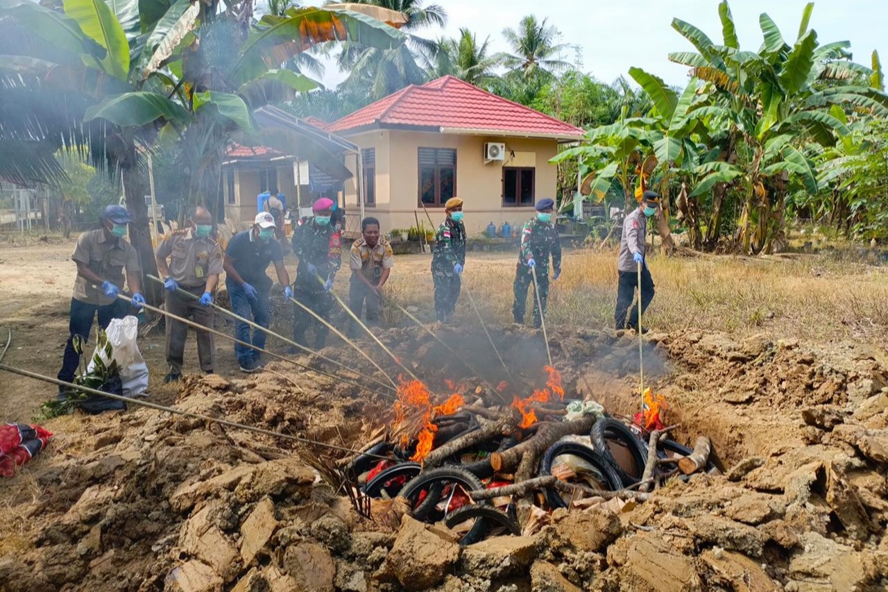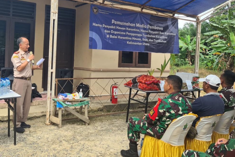 Dispen Kormar, TNI AL (Nunukan). Komandan Satgasmar Pam Ambalat XXX Kapten Marinir Oki Prabowo mengikuti kegiatan Pemusnahan Media Pembawa Hama Penyakit Hewan, Ikan, dan Tumbuhan di Rumah Dinas Balai Karantina Hewan, Ikan dan Tumbuhan Kalimantan Utara, Desa Aji Kuning, Sebatik Tengah, Nunukan, Kalimantan Utara. Selasa (09/07/2024)