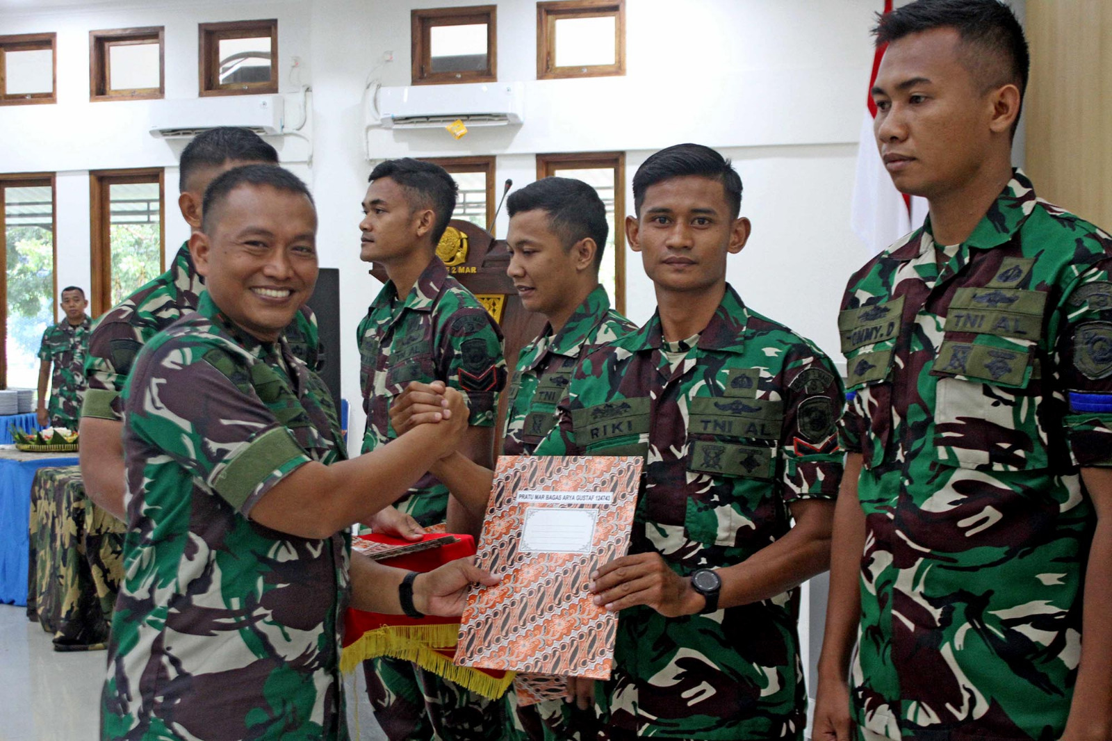 TNI AL, Dispen Kormar (Sidoarjo). Komandan Batalyon Infanteri 3 Marinir Letkol Marinir Adid Kurniawan Wicaksono, M.Tr.Opsla memimpin acara tradisi pelepasan Perwira dan memberikan Reward kepada Atlet âHiu Petarungâ Berprestasi di Bapra Kesatrian Marinir R. Suhadi Gedangan, Sidoarjo, Jawa Timur. Selasa (23/04/2024).