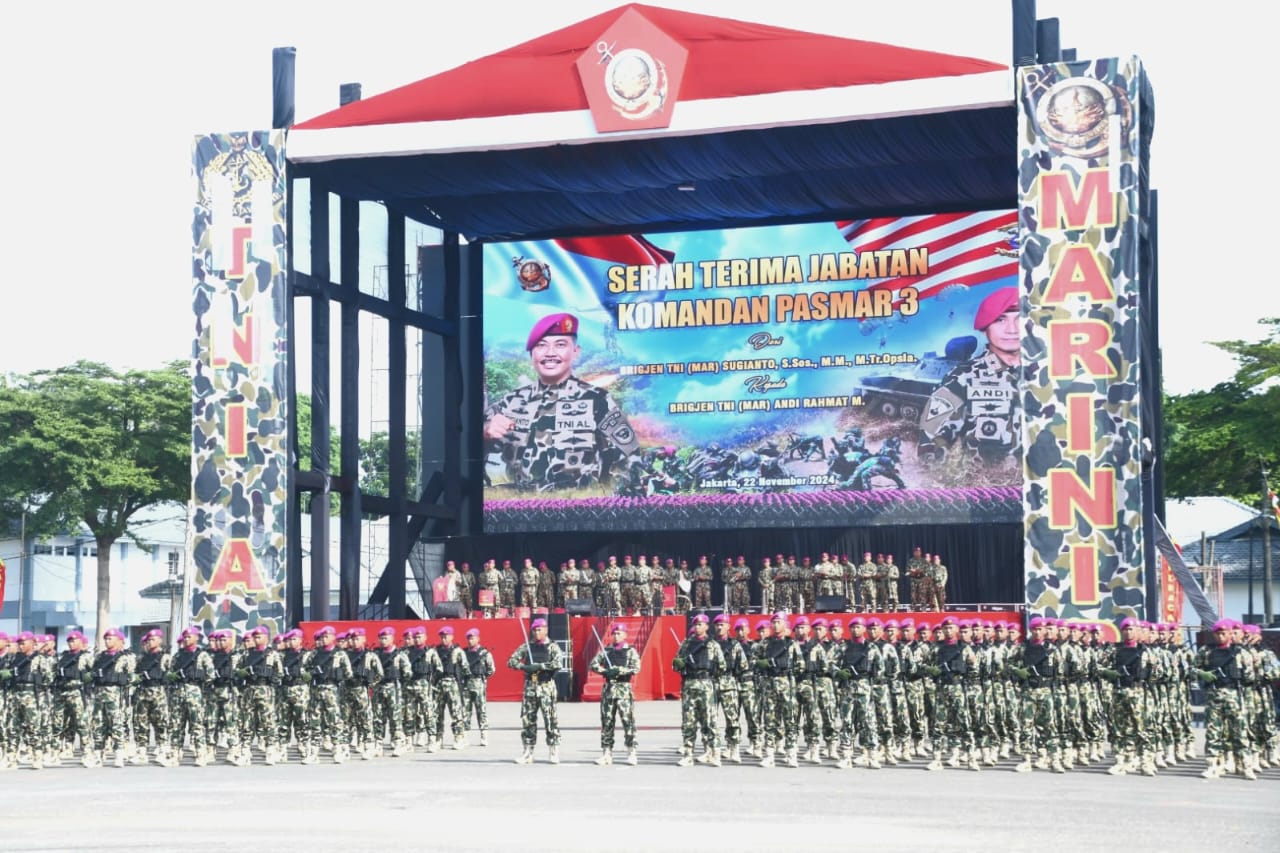 TNI AL, Dispen Kormar Sorong. Pelaksanaan upacara Serah Terima Jabatan (Sertijab) Komandan Pasmar 3 dari Brigjen TNI (Mar) Sugianto, S.Sos., M.M., M.Tr.Opsla., kepada Brigjen TNI (Mar) Andi Rahmat M., yang berlangsung di lapangan apel Brigif 1 Marinir, Kesatrian Hartono, Cilandak, Jakarta Selatan. Jumat (22/11/2024).