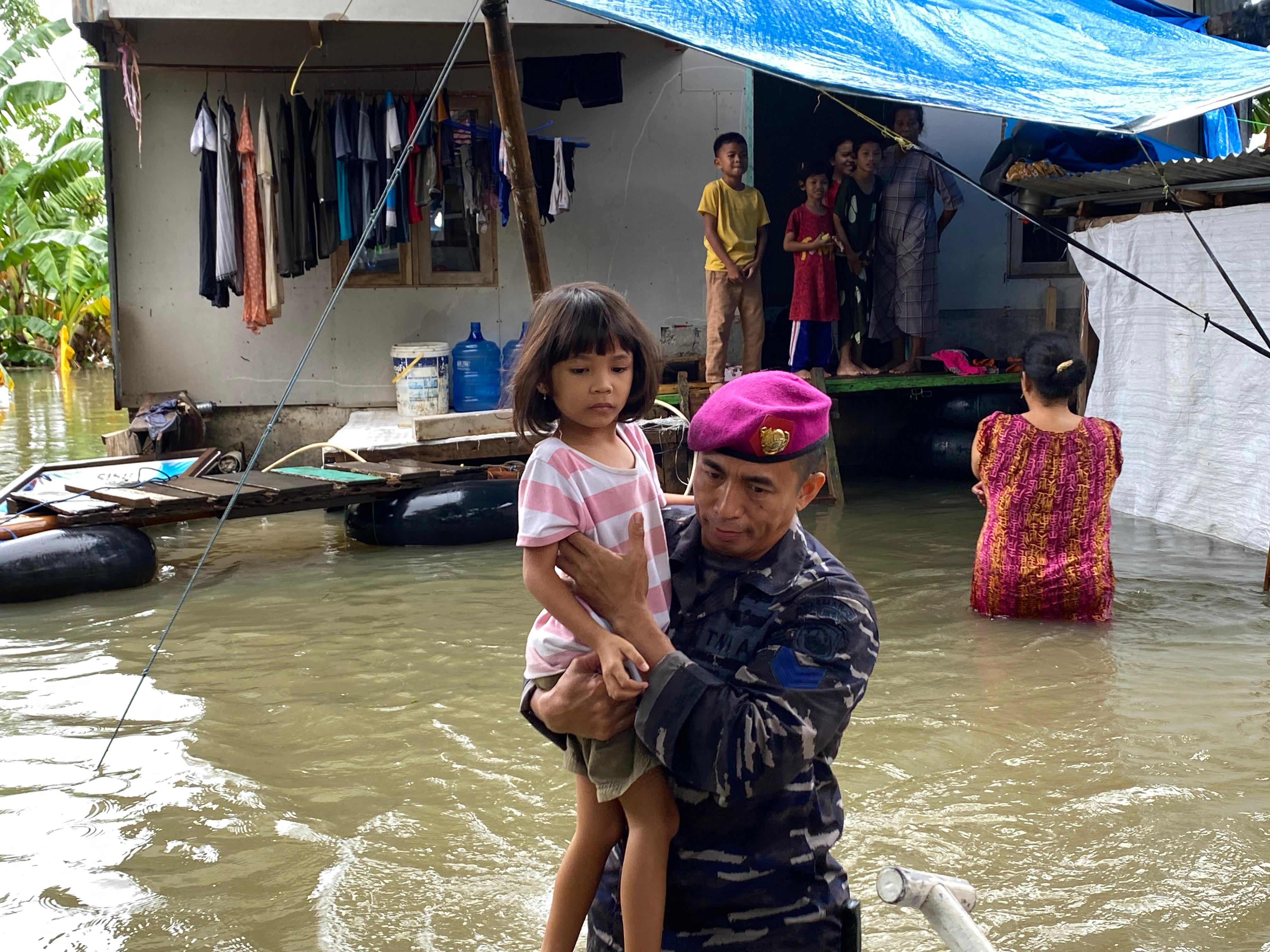 DI MAKASSAR, PRAJURIT MARINIR EVAKUASI WARGA TERJEBAK BANJIR