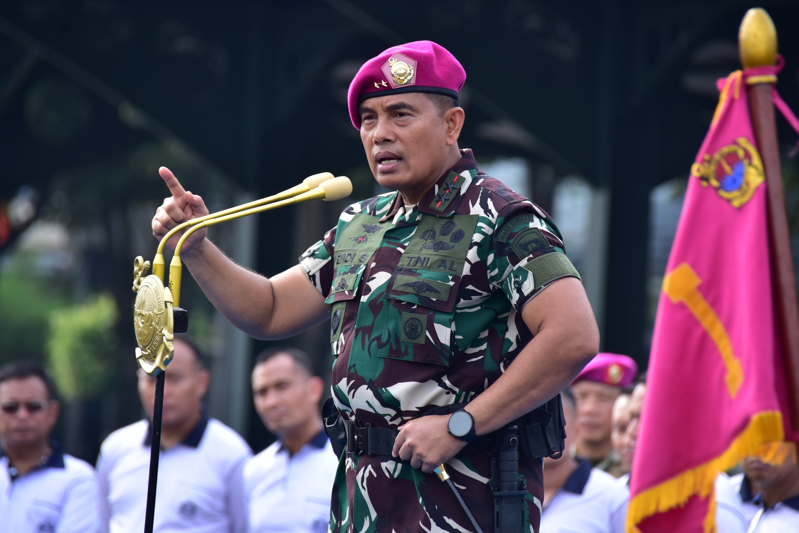 Dispen Kormar TNI Angkatan Laut (Jakarta). Komandan Korps Marinir (Dankormar) Mayor Jenderal TNI (Mar) Dr. Endi Supardi, S.E., M.M., M.Tr.Opsla., CHRMP., CRMP., memberikan motivasi dan dorongan semangat kepada para siswa Sarjana Penggerak Pembangunan Indonesia (SPPI) yang sedang melaksanakan Pendidikan Dasar Militer dan Pelatihan Manajerial di sarang petarung Marinir Cilandak Ksatrian Marinir Hartono Jakarta Selatan, Selasa (15/04/2025).