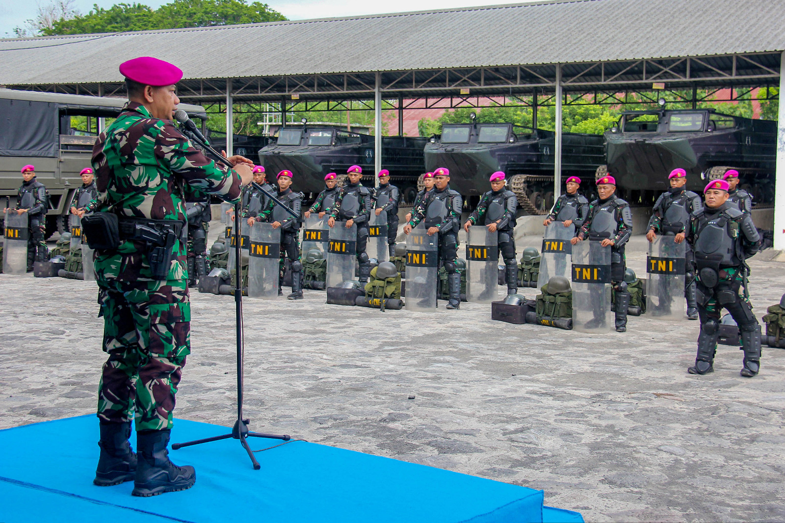 TNI Angkatan Laut, Dispen Kormar (Surabaya). Untuk menciptakan keamanan dan ketertiban masyarakat (Kamtibmas) menjelang persiapan Pemilihan Kepala Daerah (Pilkada) serentak tahun 2024, Prajurit Resimen Kavaleri 2 Marinir melaksanakan apel gelar personel dan materiel yang berlangsung di Garase kendaraan tempur Kesatrian Marinir Soepraptono, Semarung, Surabaya. Senin (18/11/2024).
