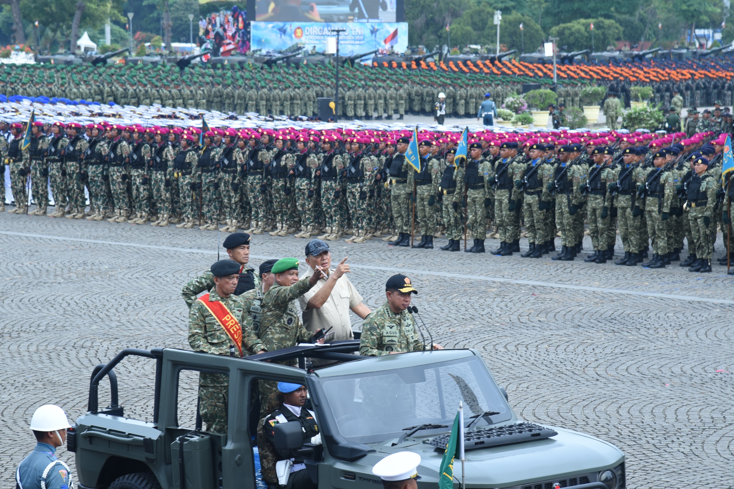 Dalam kegiatan tersebut Menteri Pertahanan Dr. Sjafrie Sjamsoeddin, M.B.A., didampingi Panglima TNI Jenderal TNI Agus Subiyanto, S.E., M.Si. memantau langsung jalannya gladi bersih dari atas kendaraan taktis Maung, bersama Wakil Panglima TNI dan para Kepala Staf Angkatan.