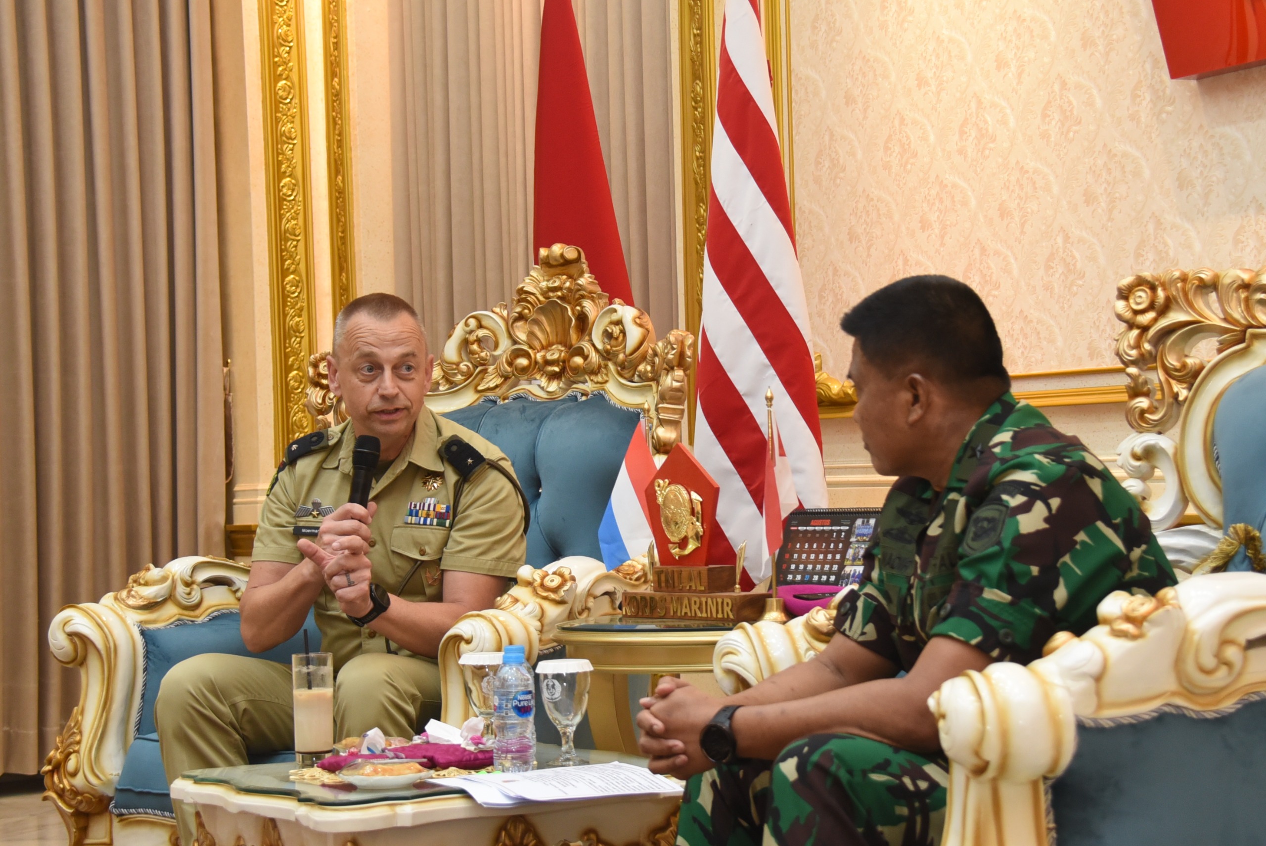 Dispen Kormar TNI Angkatan Laut (Jakarta). Panglima Korps Marinir (Pangkormar) Letnan Jenderal TNI (Mar) Dr. Endi Supardi, S.E., M.M., M.Tr. Opsla., CHRMP., CRMP., diwakili Kepala Staf Korps Marinir (Kas Kormar) Brigadir Jenderal TNI (Mar) Muhammad Nadir, M.Tr. Menerima Kunjungan Kehormatan Komandan Marinir Kerajaan Belanda Brigade General Ivo Moerman, bertempat di Admiral Room, Gedung Utama Markas Komando Korps Marinir (Mako Kormar), jalan Prajurit KKO Usman dan Harun No.40 Kwitang, Jakarta Pusat, Senin (25/08/2025).
