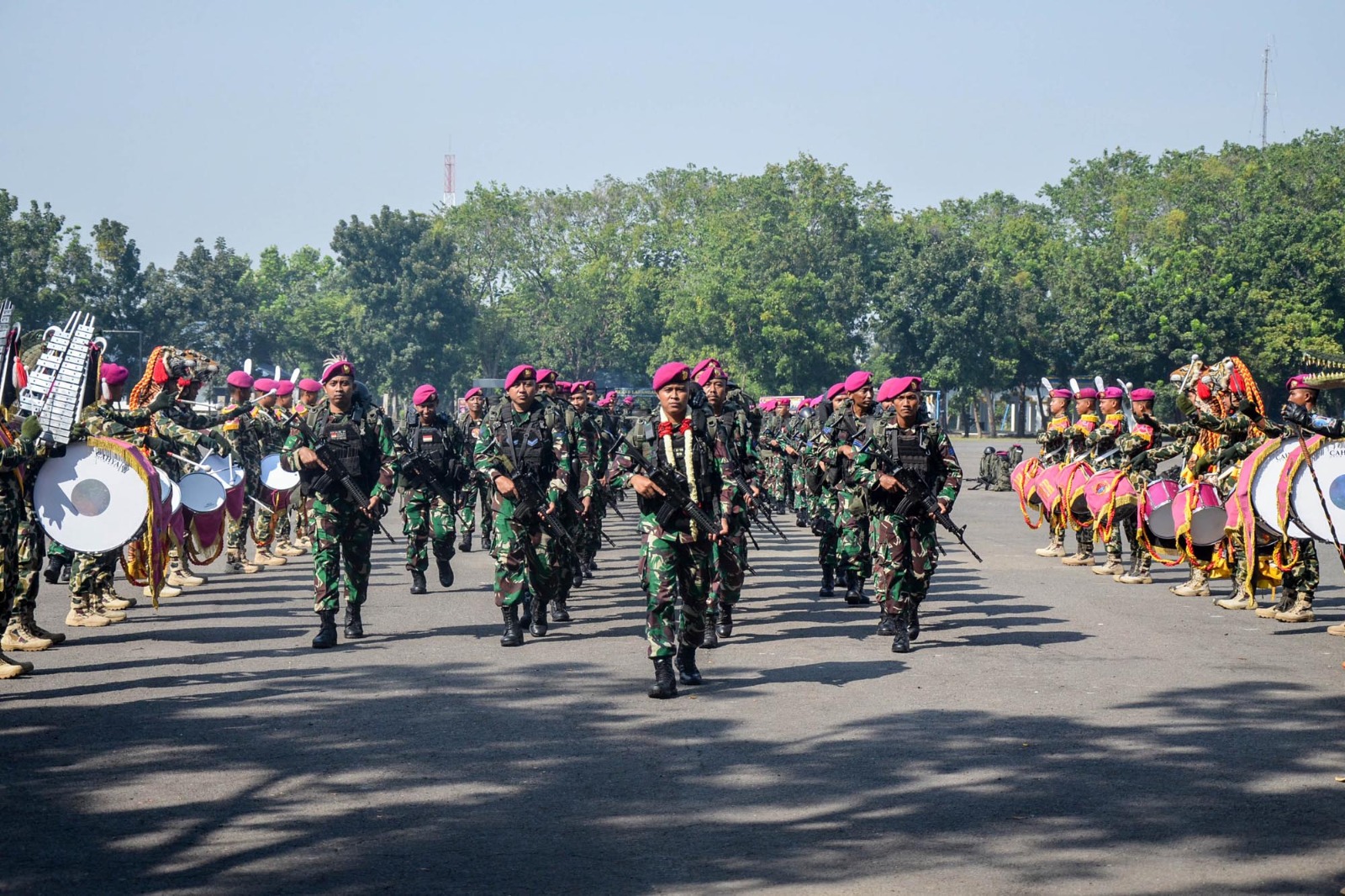 Kegiatan tersebut diawali dengan sambutan yang diiringi lagu oleh Sangkala Yudha Perkasa Drumband Korps Marinir binaan Batalyon Infanteri 1 Marinir diikuti dengan langkah tegap oleh seluruh personel Satgas yang dipimpin oleh Dansatgas Pamtas RI-PNG Mobile Gobang 1 Kapten Marinir Alvian Yana Stya, S.S.T.Han., menuju depan Mayonif 1 Marinir.