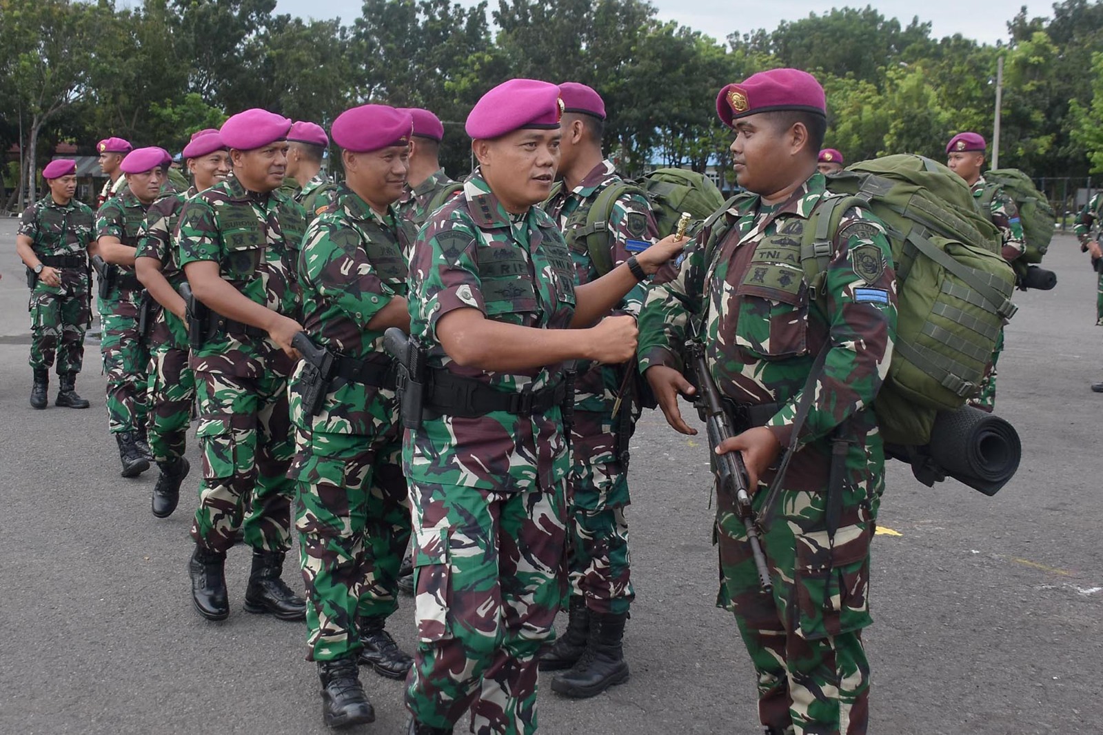 TNI AL, Dispen Kormar (Sidoarjo). Komandan Brigif 2 Marinir Kolonel Marinir Arip Supriyadi, S.H., M.M., M.Tr.Hanla memberikan arahan kepada personel Satgasmar Pam Ambalat XXIX tahun 2024 di lapangan Rencong Sakti Kesatrian Marinir R. Suhadi, Gedangan, Sidoarjo, Jawa Timur. Kamis (04/07/2024).