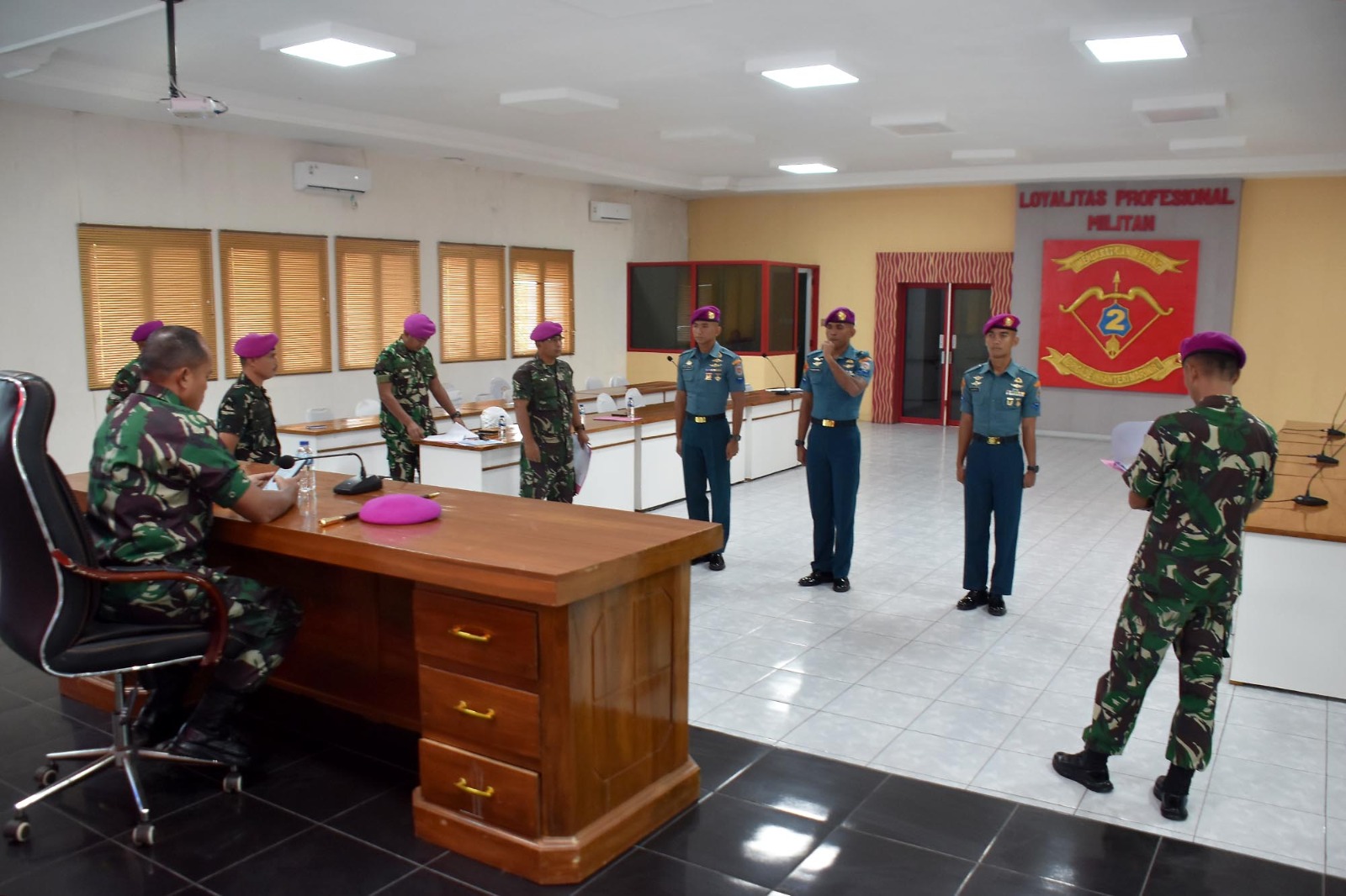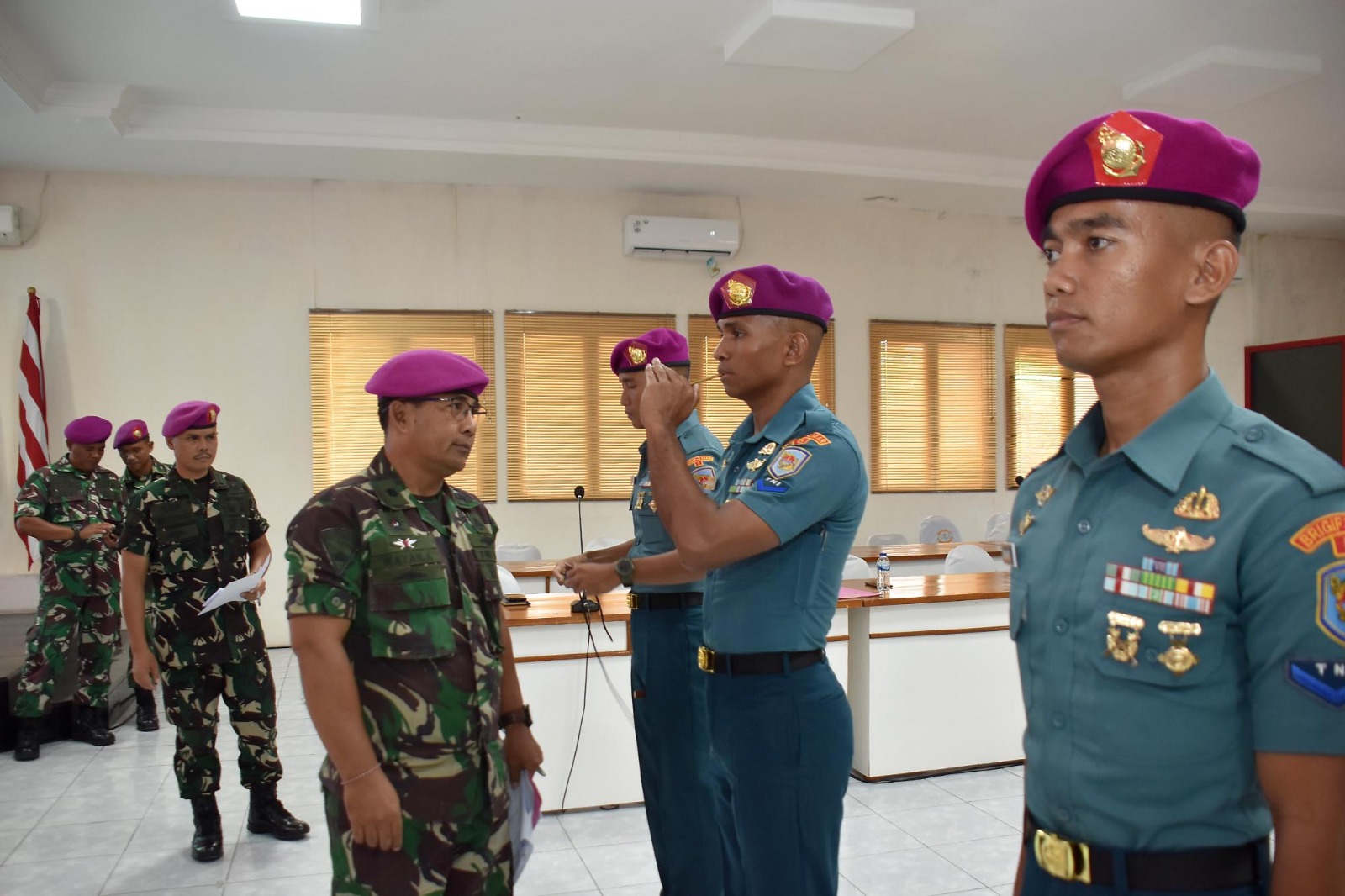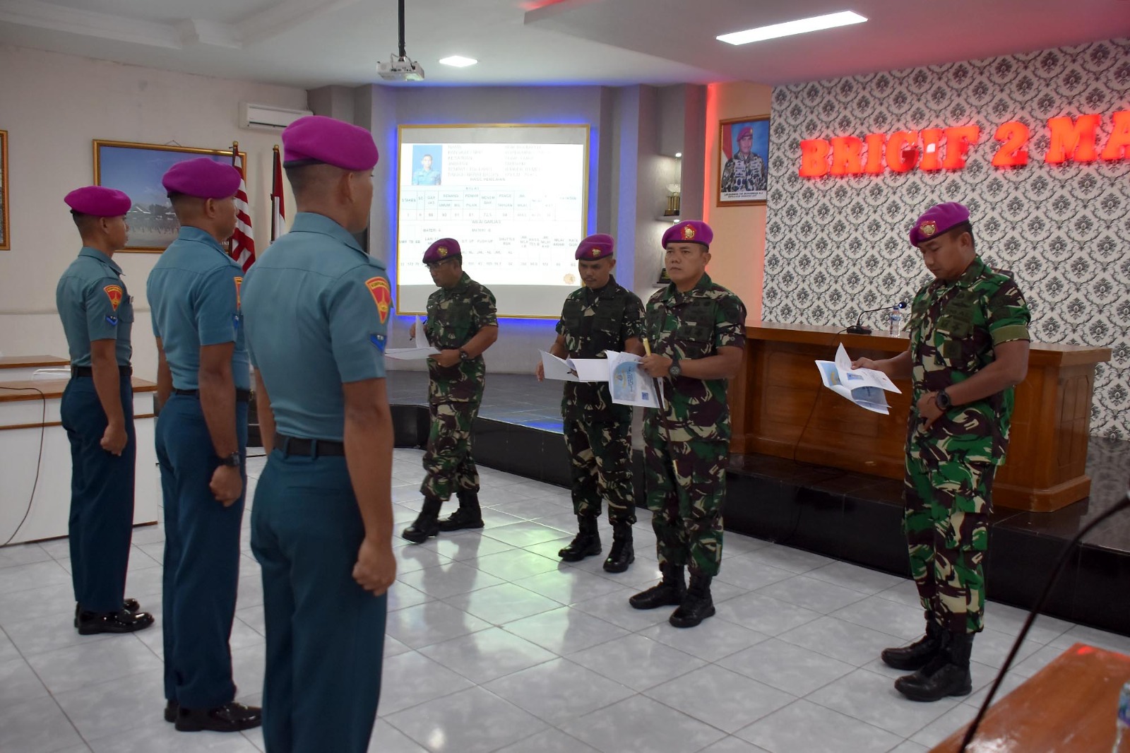 TNI AL, Dispen Kormar (Sidoarjo). Komandan Brigif 2 Marinir Kolonel Marinir Arip Supriyadi, S.H., M.M., M.Tr.Hanla melaksanakan penilaian kepada prajurit terbaiknya menjelang pelaksanaan seleksi Tamtama Teladan tahun 2024 tingkat Pasmar 2, di ruang rapat Brigif 2 Marinir Gedangan, Sidoarjo, Jawa Timur. Senin (13/05/2024).