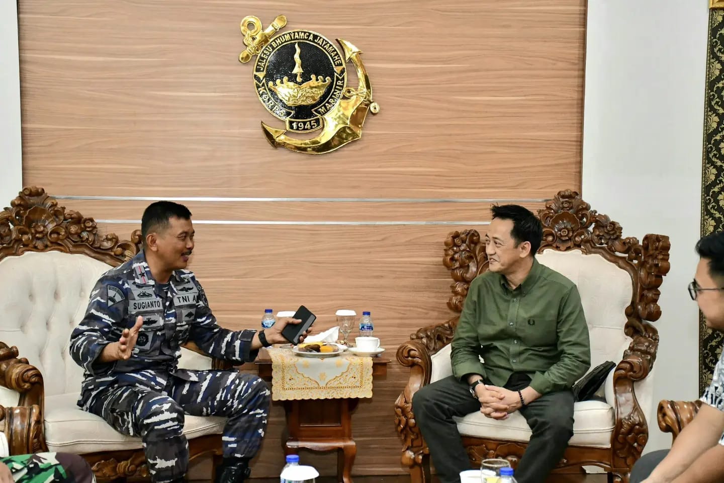 TNI AL, Dispen Kormar Sorong. Komandan Pasmar 3 Brigjen TNI (Mar) Sugianto, S. Sos., M.M., menerima kunjungan Direktur PT Tara Fazza Utama Bapak Amran Budiman di ruang VIP Mako Pasmar 3, Kesatrian Agoes Soebekti, Jl. Sorong-Klamono, Km.16, Distrik Klaurung, Kota Sorong, Papua Barat Daya. Kamis (25/04/2024).