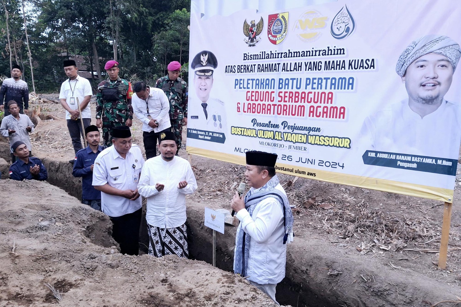 Dispen Kormar, TNI AL (Jember). Sebagai bentuk sinergitas dengan pemerintah daerah, Dansatgasmar Pam Puter XXVIII TA.2024 Pulau Nusa Barung Letda Mar Ery Subiyasno mendampingi Bupati Jember Ir. H. Hendy Siswanto ST., IPU., ASEAN Eng., melakukan Peletakan Batu Pertama Pembangunan Gedung Serba Guna dan Laboratorium Agama, di Ponpes Bustanul Ulum Al Yaqin Wassurur, Desa Mlokorejo, Kec. Puger, Kab. Jember. Rabu (26/06/2024).