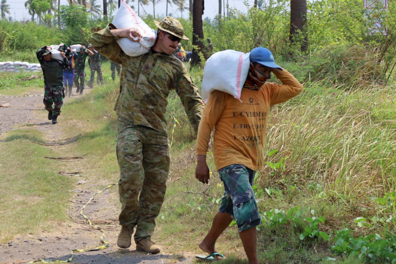 Dispen Kormar, TNI Angkatan Laut (Situbondo). Wujud kekompakan TNI dengan Prajurit Negara Sahabat, prajurit Korps Marinir Batalyon Infanteri 3 Marinir dan Australian Defence Force (ADF) bersama Masyarakat Banongan memperbaiki fillbox pertahanan sasaran Latihan Gabungan Bersama (Latgabma) Keris Woomera Tahun 2024 di Pantai Banongan, Asembagus, Situbondo, Jawa Timur. Senin (11/11/2024).