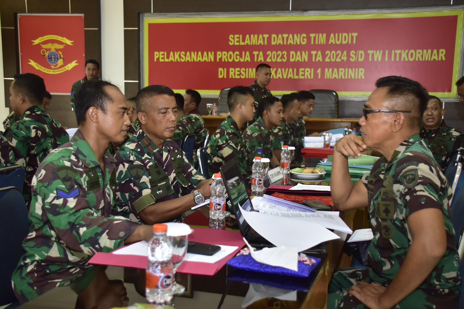 Komandan Resimen Kavaleri 1 Marinir (Danmenkav 1 Mar) Kolonel Marinir Ukik Ari Nursanto, M. Tr. Hanla., M.M., menerima kunjungan Tim Wasrik dari Inspektorat Korps Marinir (Itkormar) di Balai Prajurit (Bapra) Mako Menkav-1 Marinir Cilandak Jakarta Selatan.