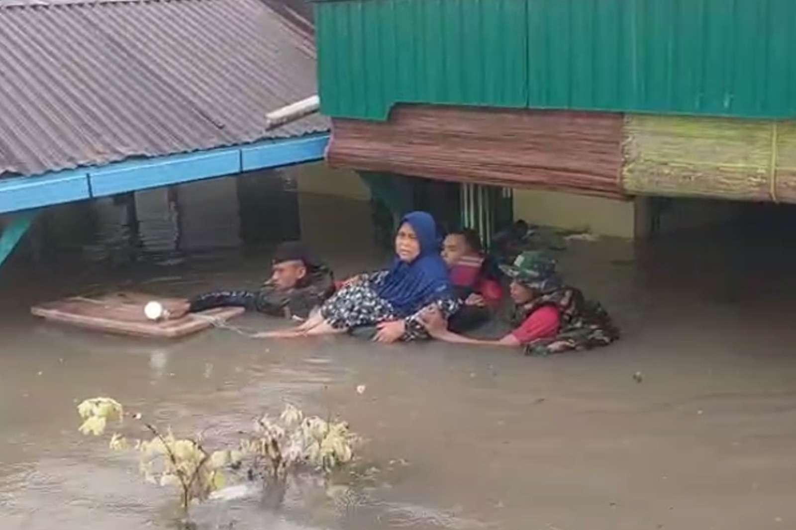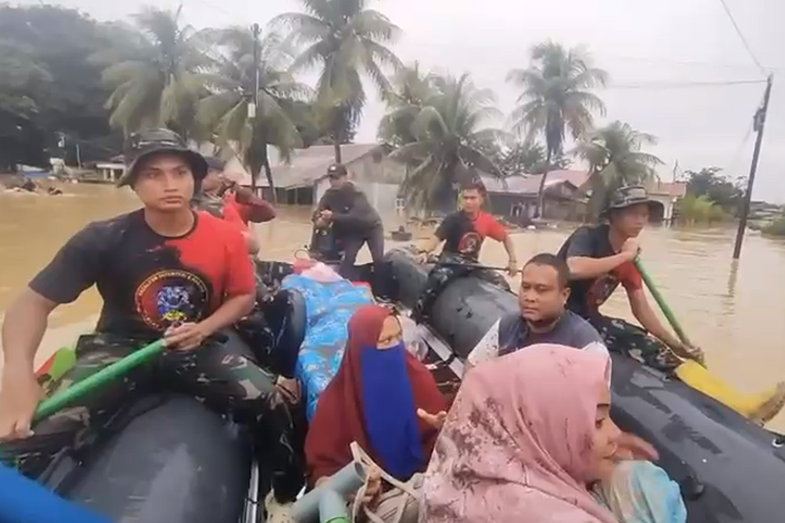 Prajurit Batalyon Infanteri 8 Marinir melaksanakan evakuasi secara cepat dengan menggunakan perahu karet menyusuri arus deras. Mereka menjemput warga yang terjebak di dalam rumah, di atap bangunan, hingga yang bertahan di atas pohon. Upaya berisiko tinggi ini berhasil menyelamatkan puluhan warga termasuk anak-anak dan lansia, meski medan licin serta potensi longsor susulan terus mengancam.