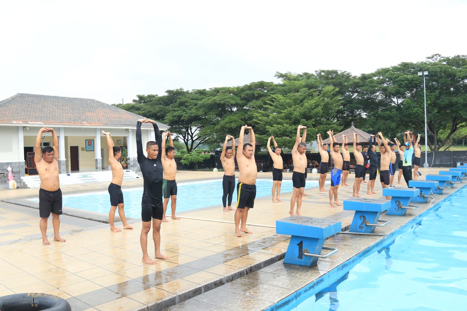 Sebelum kegiatan latihan renang diawali dengan peregangan dan pemanasan untuk melemaskan otot tangan, kaki serta perut demi mencegah terjadinya kram pada saat pelaksanaan renang, setelah melaksanakan pemanasan para prajurit memasuki kolam renang dan mulai melaksanakan renang dengan jarak 300 meter.