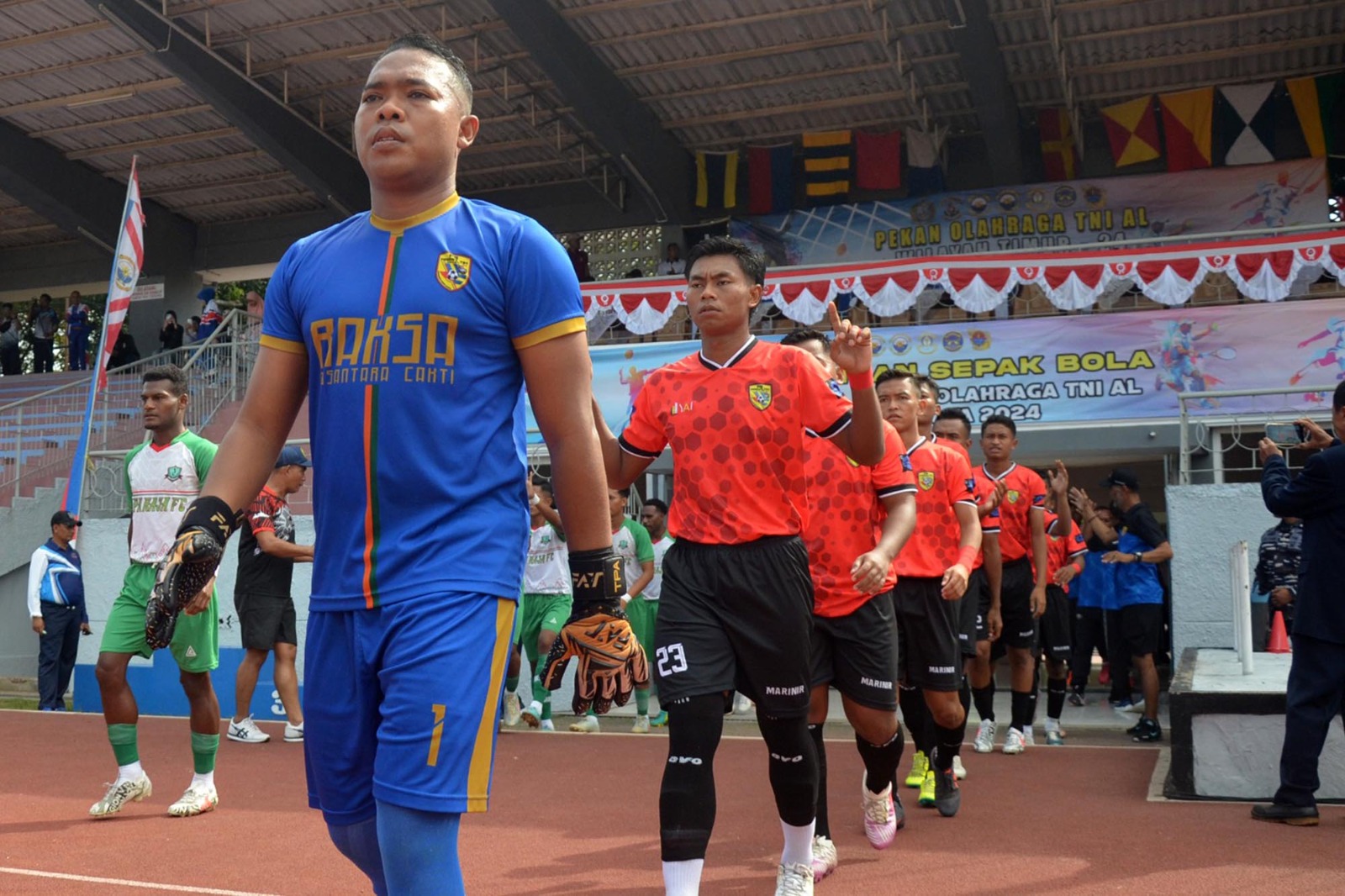 TNI AL, Dispen Kormar (Surabaya) Atlet Sepak Bola Yonif 1 Marinir yang tergabung pada Tim Marwiltim berhasil mengantarkan cabang sepakbola menjadi juara pada pertandingan final sepak bola Poral Wiltim di Stadion Jala Krida Mandala Akademi Angkatan Laut Bumimoro, Surabaya, Jawa Timur.(29/06/2024)