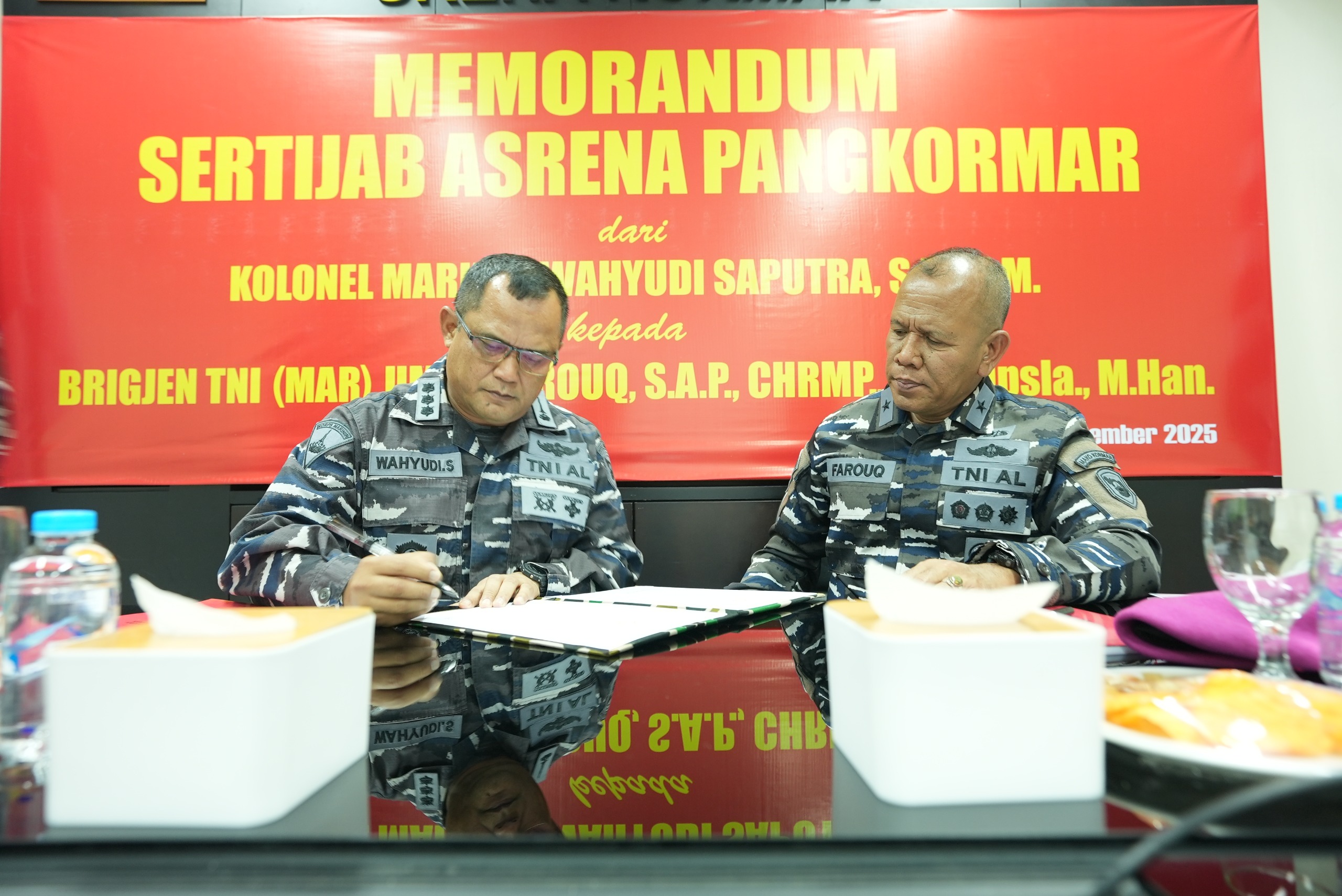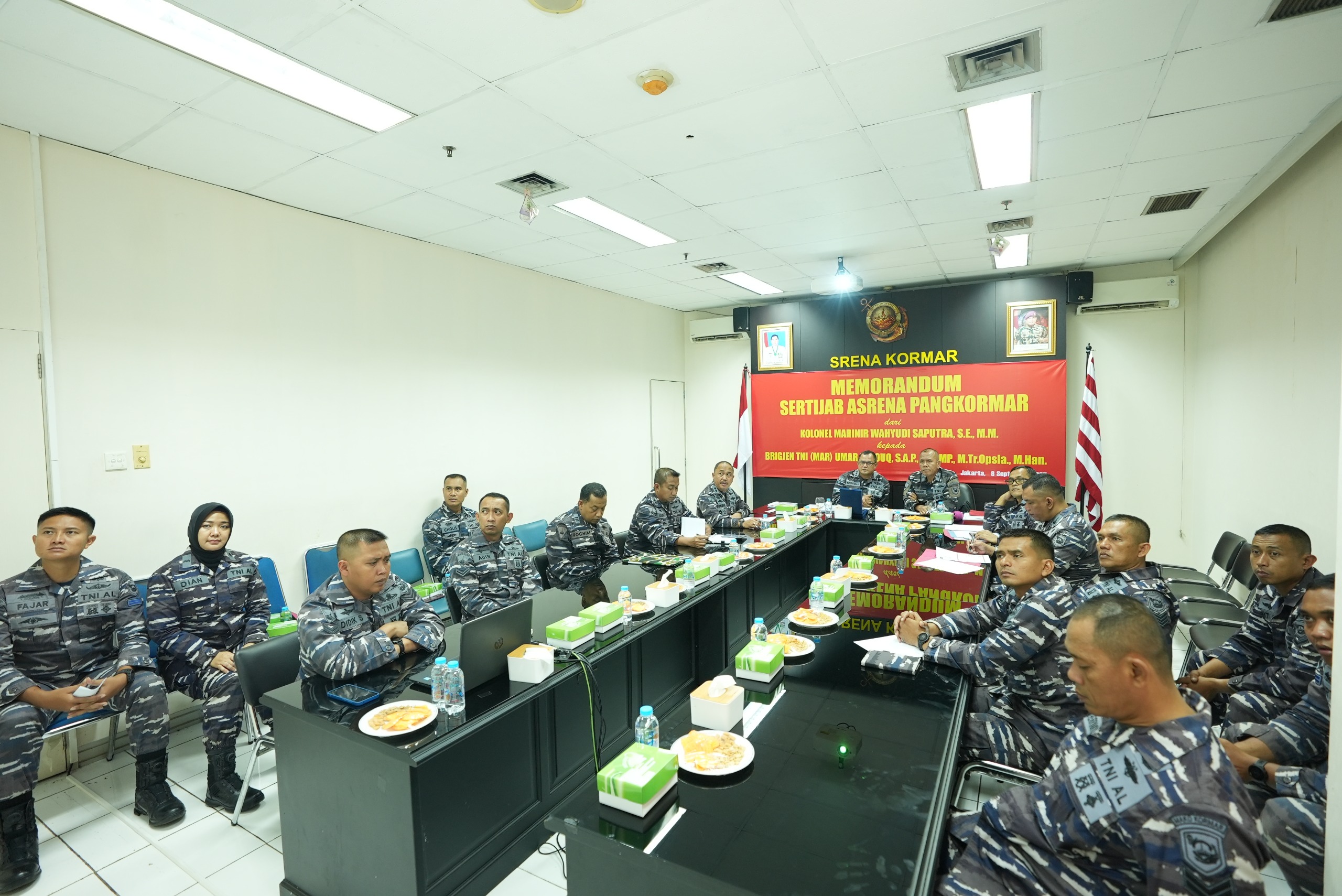 Dispen Kormar TNI Angkatan Laut (Jakarta). Menjelang dilaksanakannya Serah Terima Jabatan (Sertijab) Asisten Perencanaan dan Anggaran Panglima Korps Marinir (Asrena Pangkormar), dilaksanakan pembacaan memorandum oleh pejabat lama Kolonel Marinir Wahyudi Saputra, S. E., M.M. kepada pejabat baru Brigjen TNI (Mar) Umar Farouq, S.A.P., CHRMP., M.Tr.Opsla., M.Han., di ruang rapat Srena Kormar, gedung Agoes Soebekti Kesatrian Marinir Ali Sadikin Mako Kormar, Jl. Prajurit KKO Usman dan Harun No.40, Jakarta Pusat, Senin (08/09/2025).