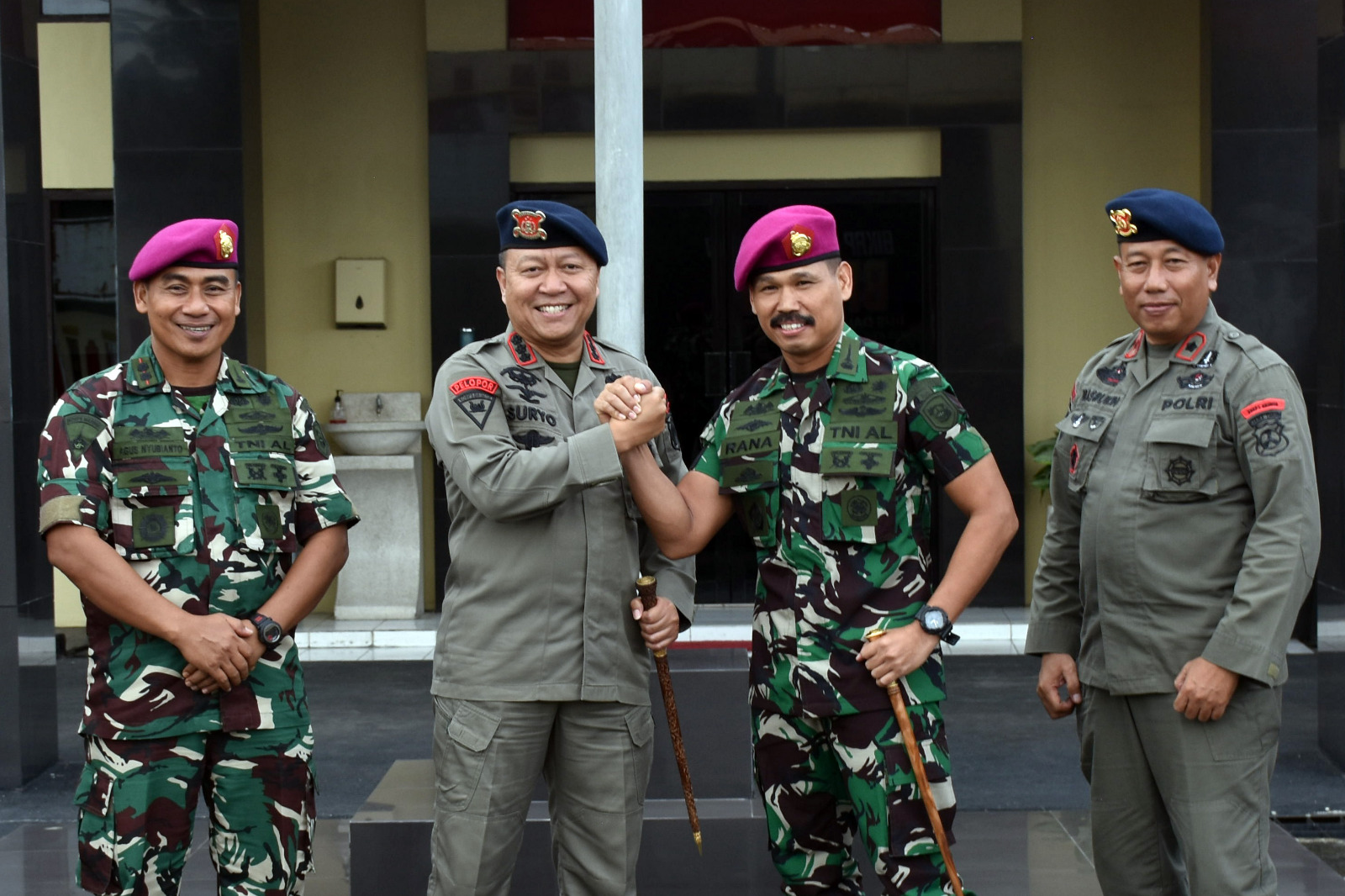 TNI AL. Dispen Kormar (Surabaya). Dalam rangka untuk menjaga sinergitas dan soliditas TNI Polri, Komandan Menart 2 Marinir Kolonel Marinir Rana Karyana, S.E.,M.Tr.Hanla.,M.M.,CRHMP bersama Perwira Staf mengunjungi Mako Brimob Polda Jatim di Jl Bhayangkara No 74, Taman â Sidoarjo. Rabu (24/04/2024).