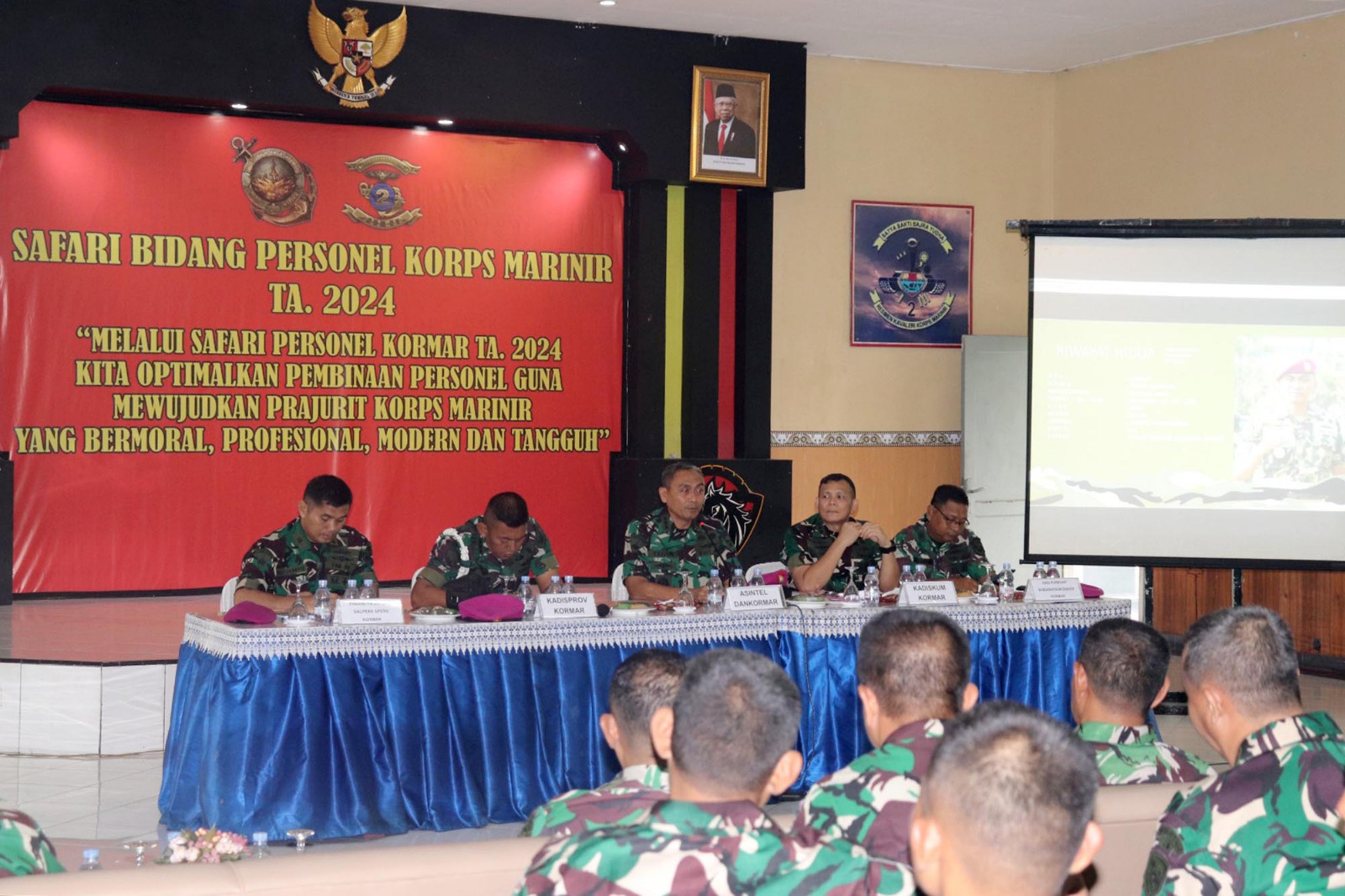 TNI AL, Dispen Kormar (Surabaya). Prajurit Batalyon Infanteri 5 Marinir mengikuti kegiatan Safari Bidang Personel Korps Marinir TA.2024 yang disampaikan langsung oleh Asintel Dankormar Kolonel Marinir Teguh Santoso di Balai Prajurit Yonranratfib 2 Marinir Semarung, Ujung, Surabaya, Jawa Timur. Rabu (24/04/2024).