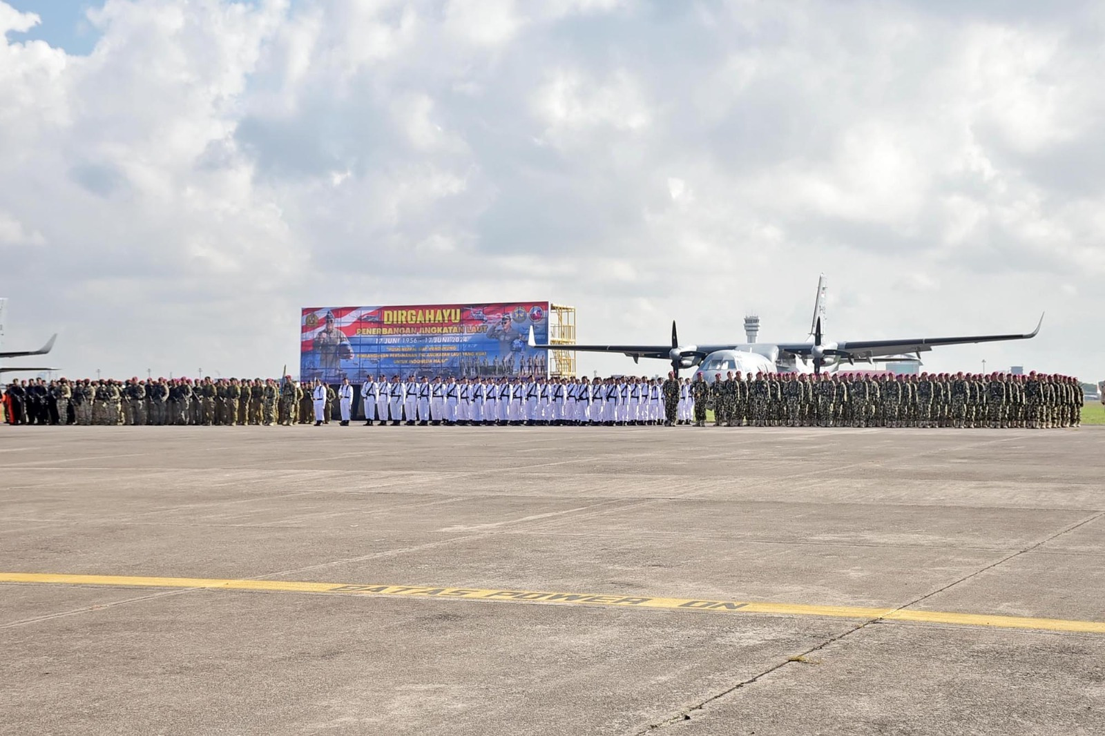 Dispen Kormar, TNI AL (Sidoarjo). Prajurit Brigif 2 Marinir dibawah pimpinan Mayor Marinir Kemiran terlibat dalam upacara parade dan Defile peringatan HUT Ke-68 Penerbangan TNI Angkatan Laut di Apron Hanggar Pangkalan Udara Angkatan Laut Juanda, Sidoarjo. Kamis (27/06/2024).