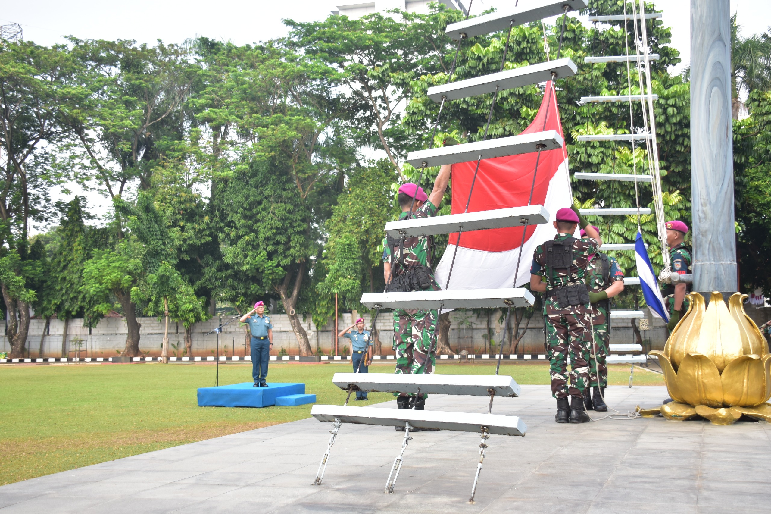 Upacara bendera diawali dengan pengibaran bendera Merah Putih, penghomatan senjata kepada bendera merah putih, pembacaan teks Pancasila, dan mengheningkan cipta.
