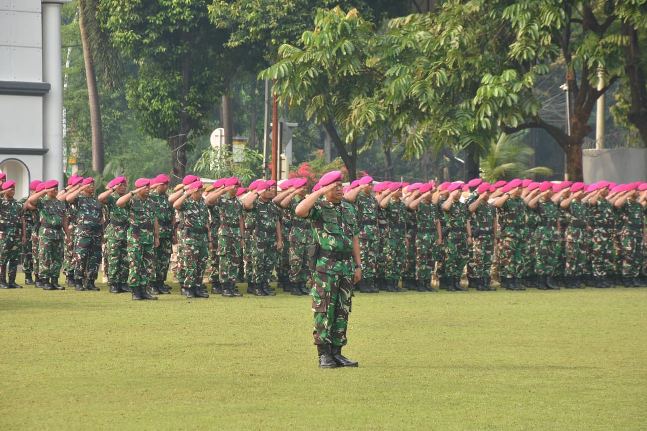 Dispen Kormar TNI Angkatan Laut (Jakarta). Prajurit dan Pegawai Negeri Sipil (PNS) Markas Komando Korps Marinir (Mako Kormar) melaksanakan upacara penaikan bendera merah putih yang berlangsung di Lapangan Apel Mako Kormar, Kesatrian Ali Sadikin, Jl. Prajurit KKO Usman dan Harun No. 40 Jakarta Pusat. Senin (20/10/2025).