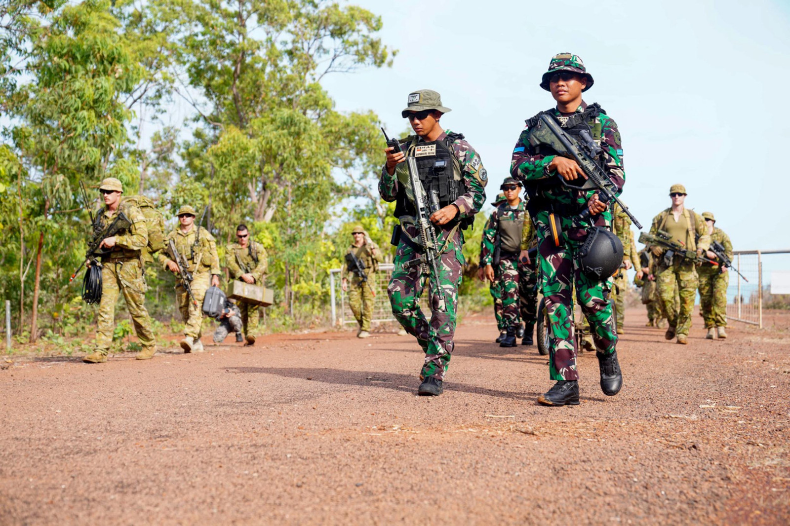 Dispen Kormar, TNI Angkatan Laut (Australia). Dalam rangka Latihan Gabungan Bersama (Latgabma) Keris Woomera Ta. 2024, sebanyak 25 prajurit âHiu Petarungâ di bawah pimpinan Wakil Perwira Staf Operasi Yonif 3 Marinir TNI AL Kapten Marinir Adam Keulana, S.Tr.(Han)., melaksanakan latihan pendaratan Amfibi di Pulau Bathurst, Australia. Selasa (5/11/2024).