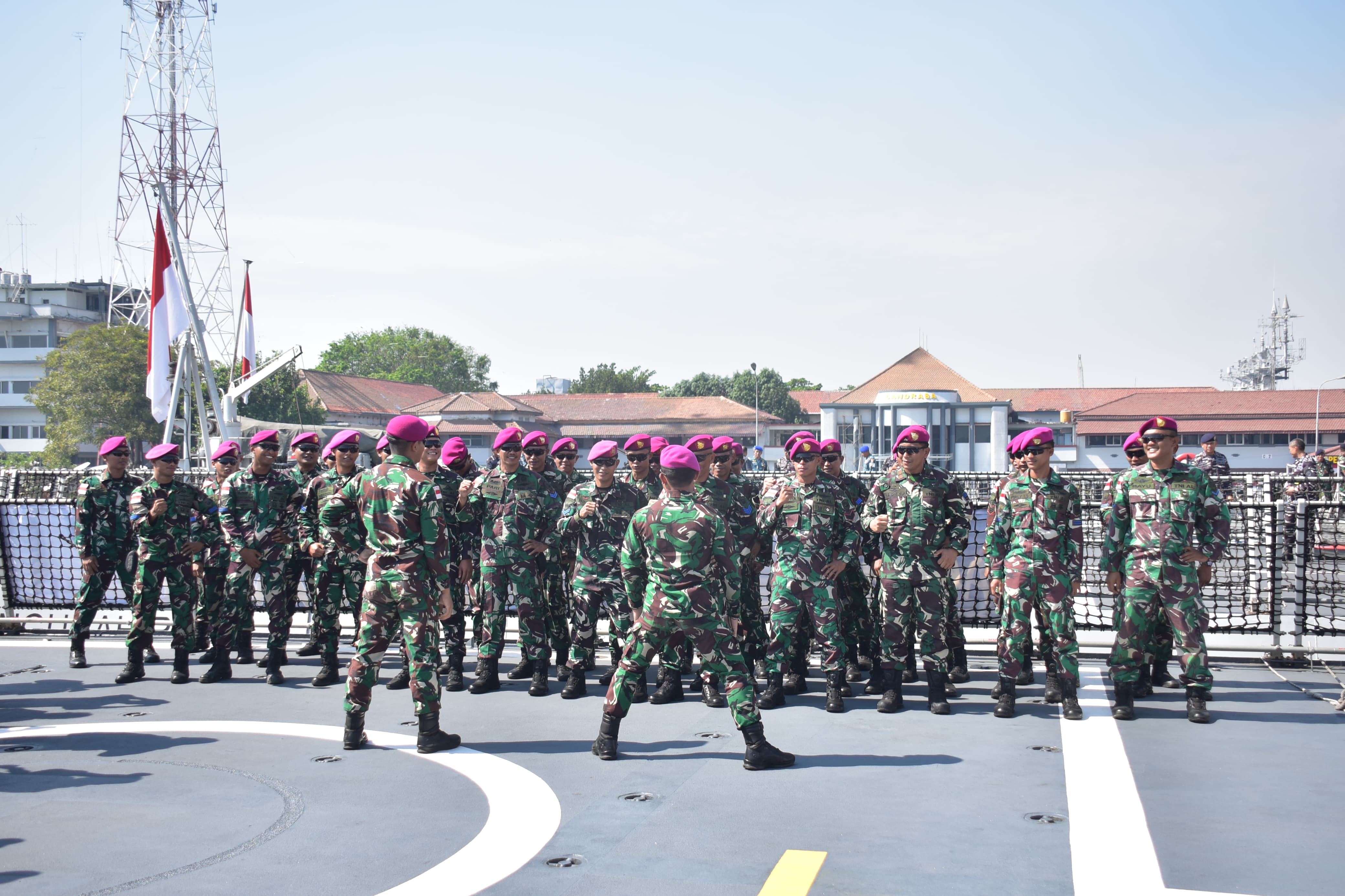 Dispen Kormar TNI Angkatan Laut (Surabaya). Prajurit Korps Marinir TNI Angkatan Laut yang tergabung dalam Satgas Multilateral Rim of The Pacific (Rimpac) 2024, ikuti penyambutan kedatangan KRI Raden Eddy Martadinata-331 yang telah kembali ke Indonesia berlayar melewati Samudra Pasifik selesai melaksanakan Latma Multilateral Rimpac 2024 Hawaii.