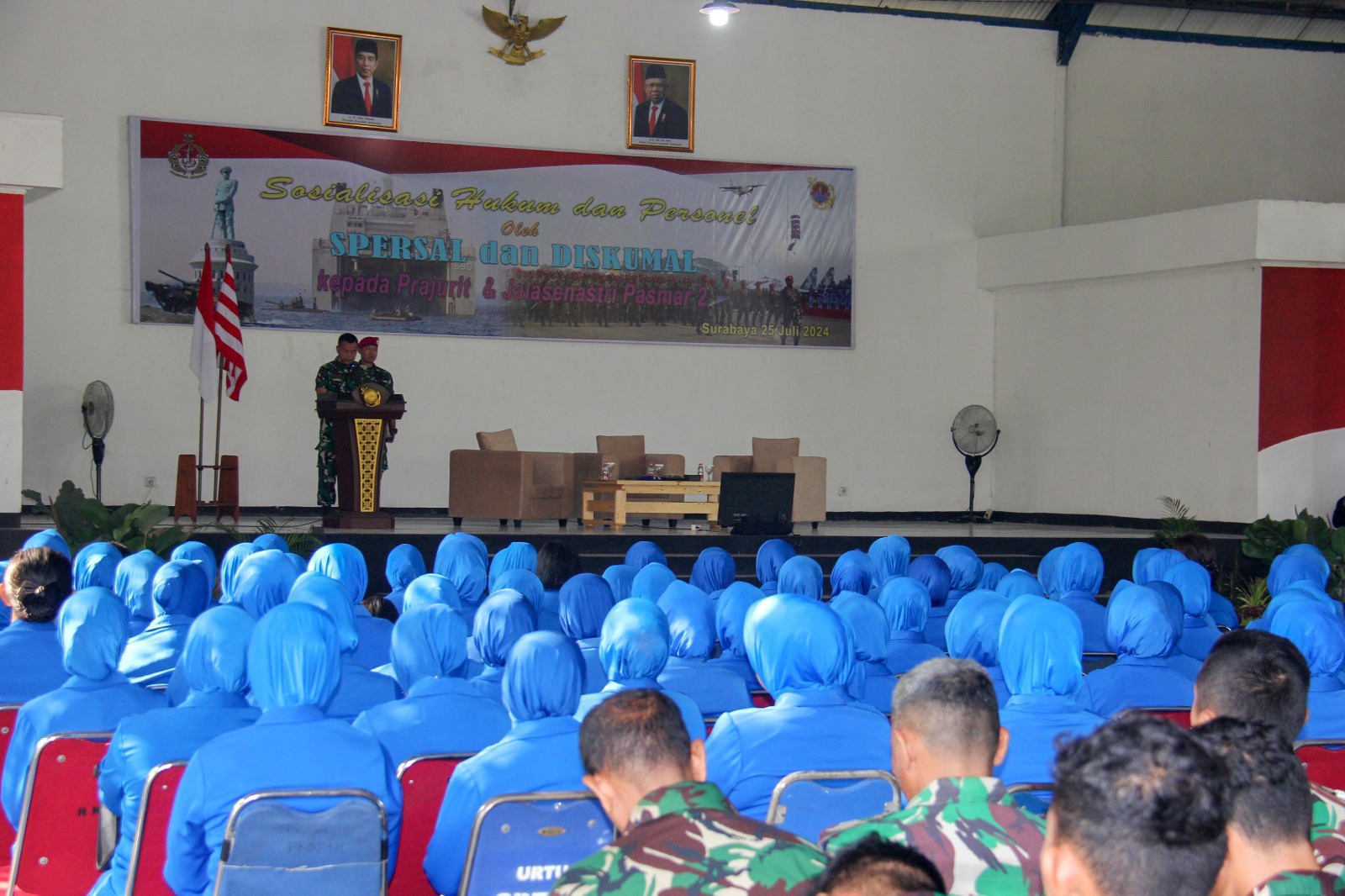 TNI Angkatan Laut, Dispen Kormar (Surabaya). Komandan Resimen Kavaleri 2 Marinir Letkol Mar La Ode Jimmy H.R., M.Tr.Hanla., M.M., bersama Dansatlak, Prajurit dan Jalasenastri Cabang 5 Korcab Pasmar 2 Gabungan Korps Marinir mengikuti Sosialisasi Hukum dan Personel dari Spersal dan Diskumal TNI Angkatan Laut Ta. 2024 yang berlangsung di Indoor Sport Kesatrian Marinir Soetedi Senaputra, Karangpilang, Surabaya. Kamis (25/07/2024).