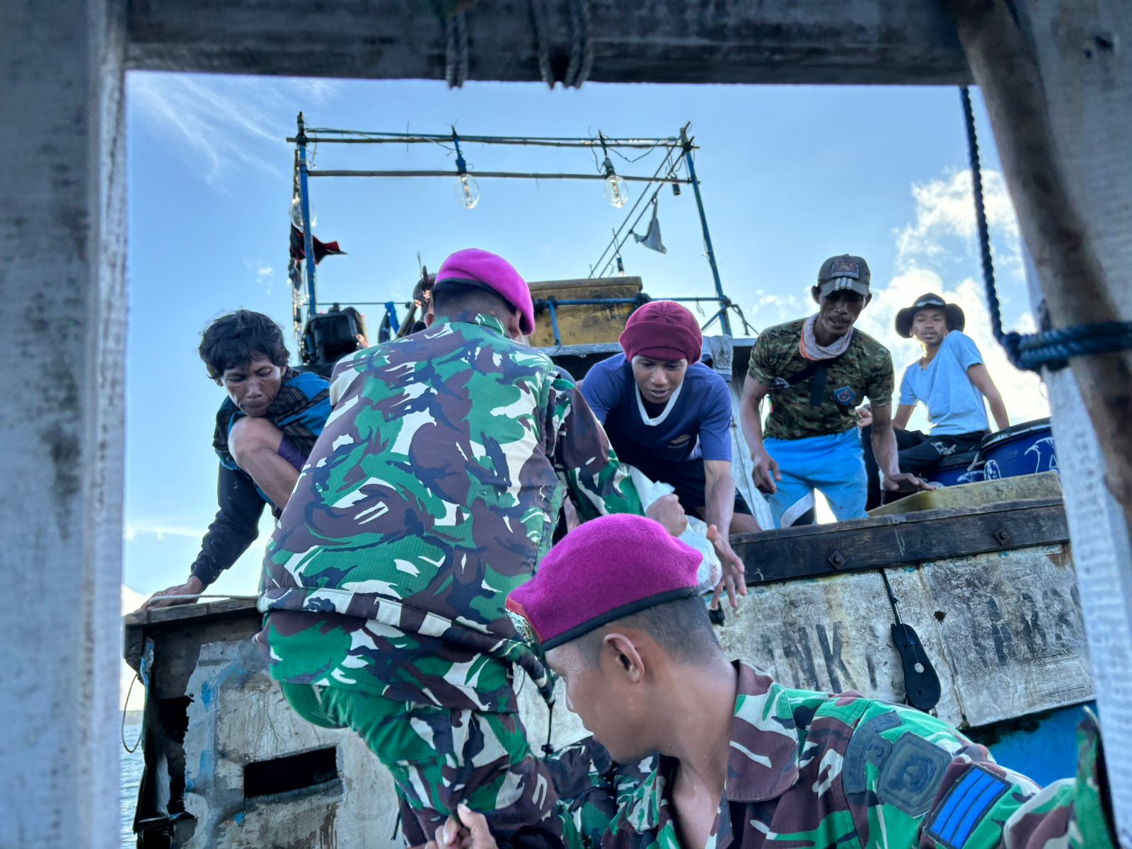 TNI AL, Dispen Kormar (Deli), Pasmar 1. Prajurit Satuan Tugas Marinir (Satgasmar) yang bertugas dalam Pengamanan Pulau Terluar (Pam Puter) di Komando Pelaksana Operasi (Kolakops) 1 Pulau Deli turut serta dalam kegiatan berbagi takjil kepada para nelayan di sekitar Pulau Deli, Rabu (27/03/2024).