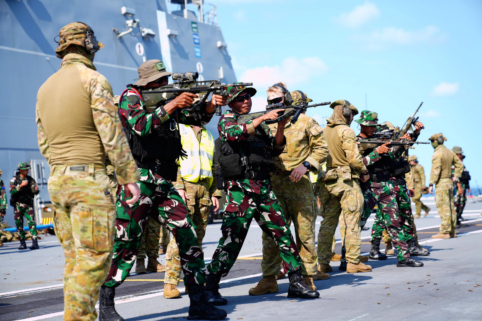 Dispen Kormar, TNI Angkatan Laut (Australia). Prajurit Batalyon Infanteri 3 Marinir melaksanakan Latihan menembak bersama Australian Defence Force (ADF) dengan materi Marksmanship dan Sniper yang dilaksanakan di atas Kapal, HMAS ADELAIDE di perairan Pulau Bathurst, Australia. Kamis (07/11/2024).