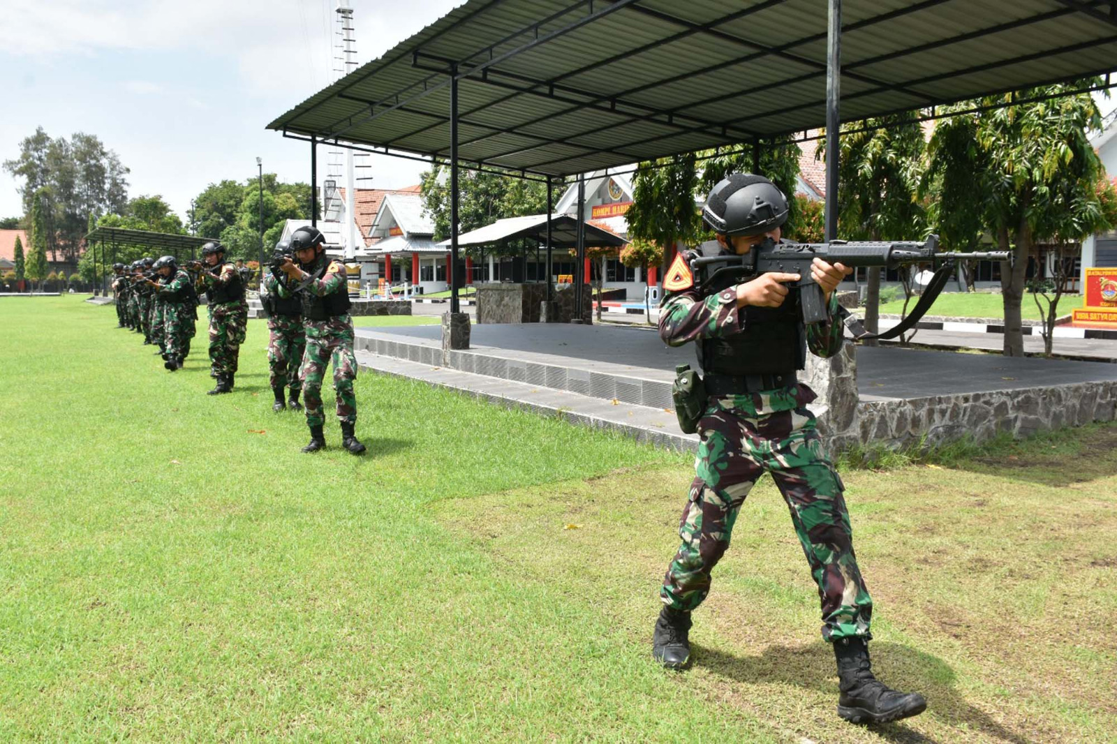 TNI AL, Dispen Kormar (Surabaya). Dalam rangka meningkatkan kemampuan bertempur, Prajurit Batalyon Infanteri 5 Marinir dan Taruna AAL Tingkat III Angkatan ke-70 Korps Marinir melaksanakan latihan drill Operasi Tempur Aspek Darat di lapangan apel Kesatrian Marinir Soeroto II Ujung, Semampir, Surabaya, Jawa Timur. Selasa (23/04/2024)