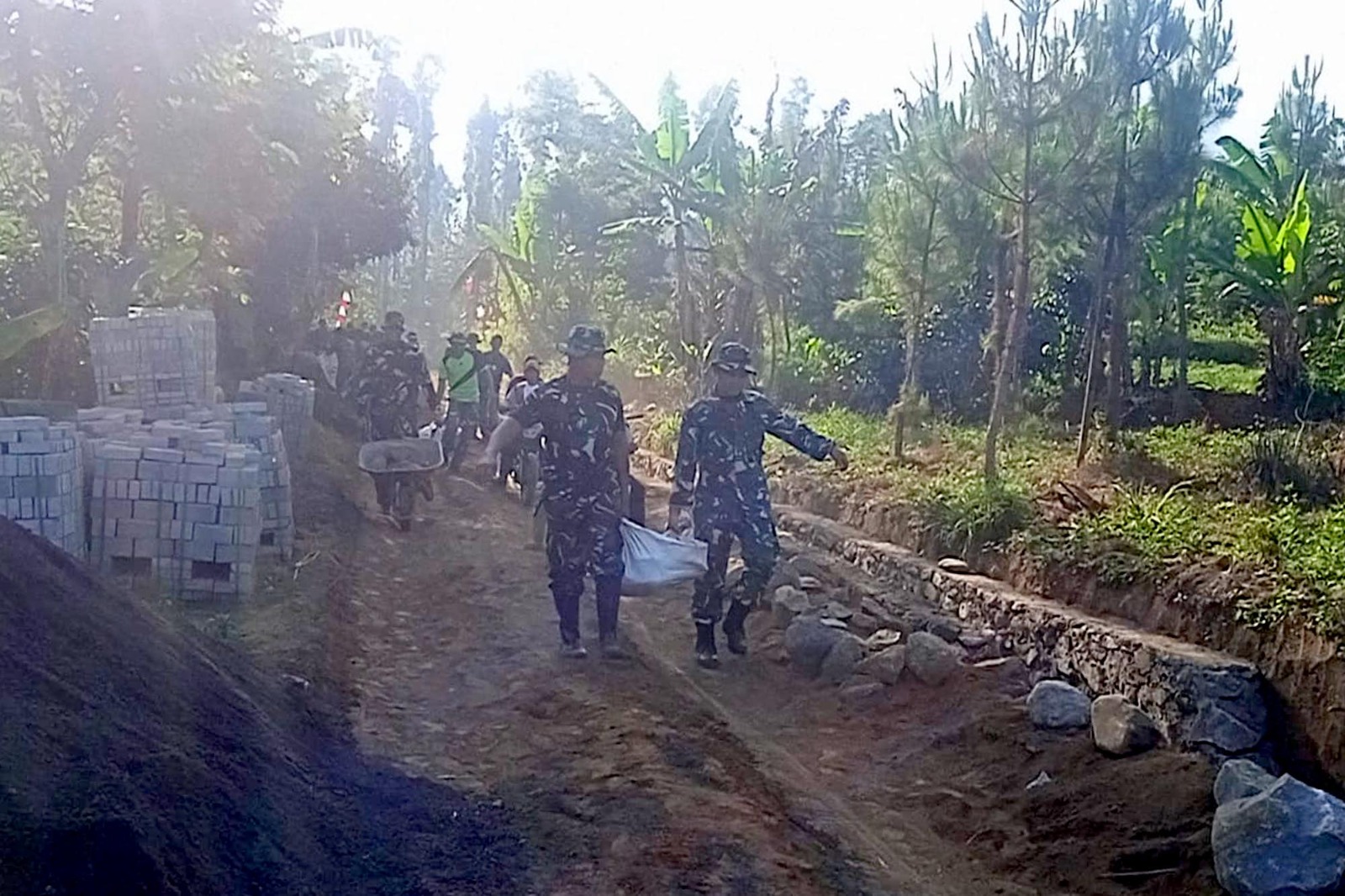 TNI AL, Dispen Kormar (Probolinggo). Prajurit Batalyon Infanteri 5 Marinir yang tergabung dalam program TNI Manunggal Membangun Desa (TMMD) ke-121 TA. 2024 di Bawah Kendali Operasi (BKO) Kodim 0820 Probolinggo melaksanakan perbaikan akses jalan dan pembangunan drainase di Dusun Cocok, Desa Kalianan, Krucil, Probolinggo, Jawa Timur. Kamis (25/07/2024).