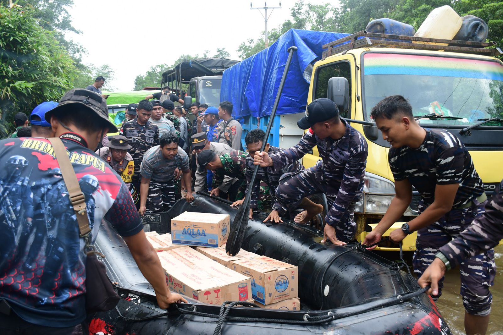 TNI AL, Dispen Kormar (Merauke). Prajurit Batalyon Marinir Pertahanan Pangkalan (Yonmarhanlan) XI Merauke dibawah pimpinan Letda Mar Prasetyo Deddy Nurhadi turut serta dalam kegiatan bantuan kepada masyarakat yang terdampak banjir di Kampung Bupul KM 185, Distrik Elikobel, Kabupaten Merauke, Provinsi Papua Selatan. Kamis (08/05/2024).