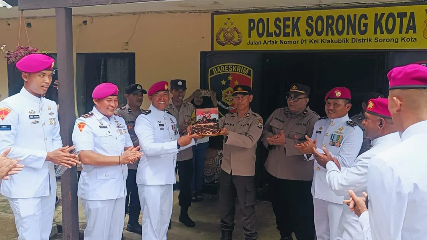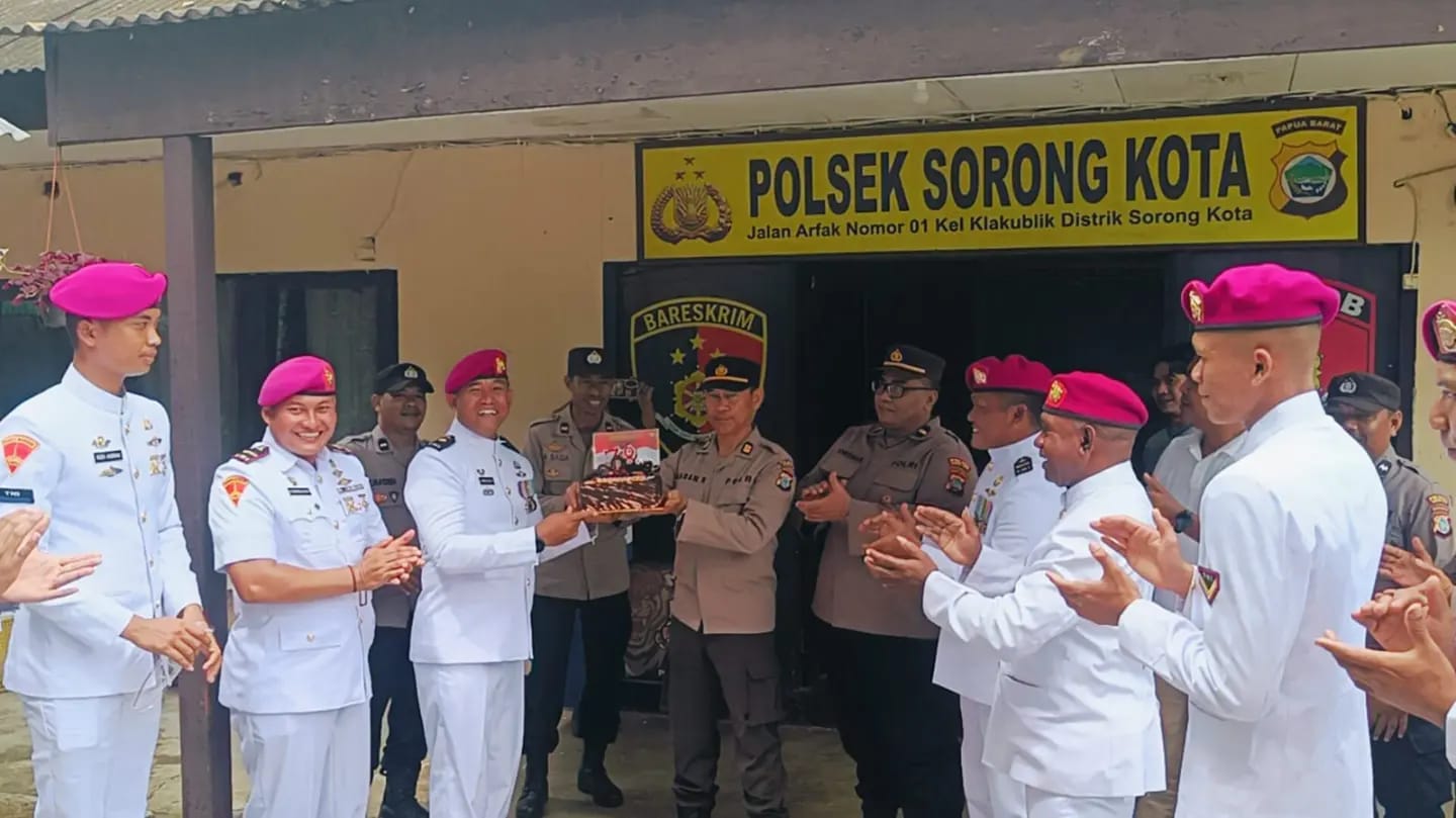 TNI AL, Dispen Kormar Sorong. Dalam rangka memperingati Hari Bhayangkara ke-78 tahun 2024, prajurit Batalyon Marinir Pertahanan Pangkalan (Yonmarhanlan) XIV Sorong memberikan kejutan kepada personel Polsek Sorong Kota, Jl. Kuda Laut, Kel. Klakublik, Distrik Sorong Kota, Kota Sorong, Papua Barat Daya. Senin (01/07/2024)