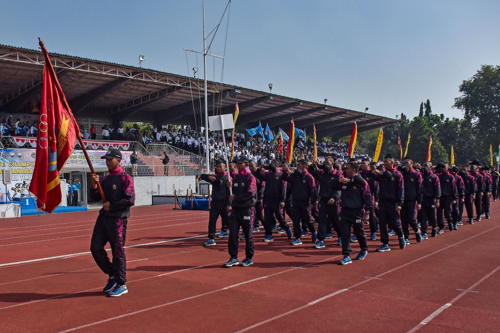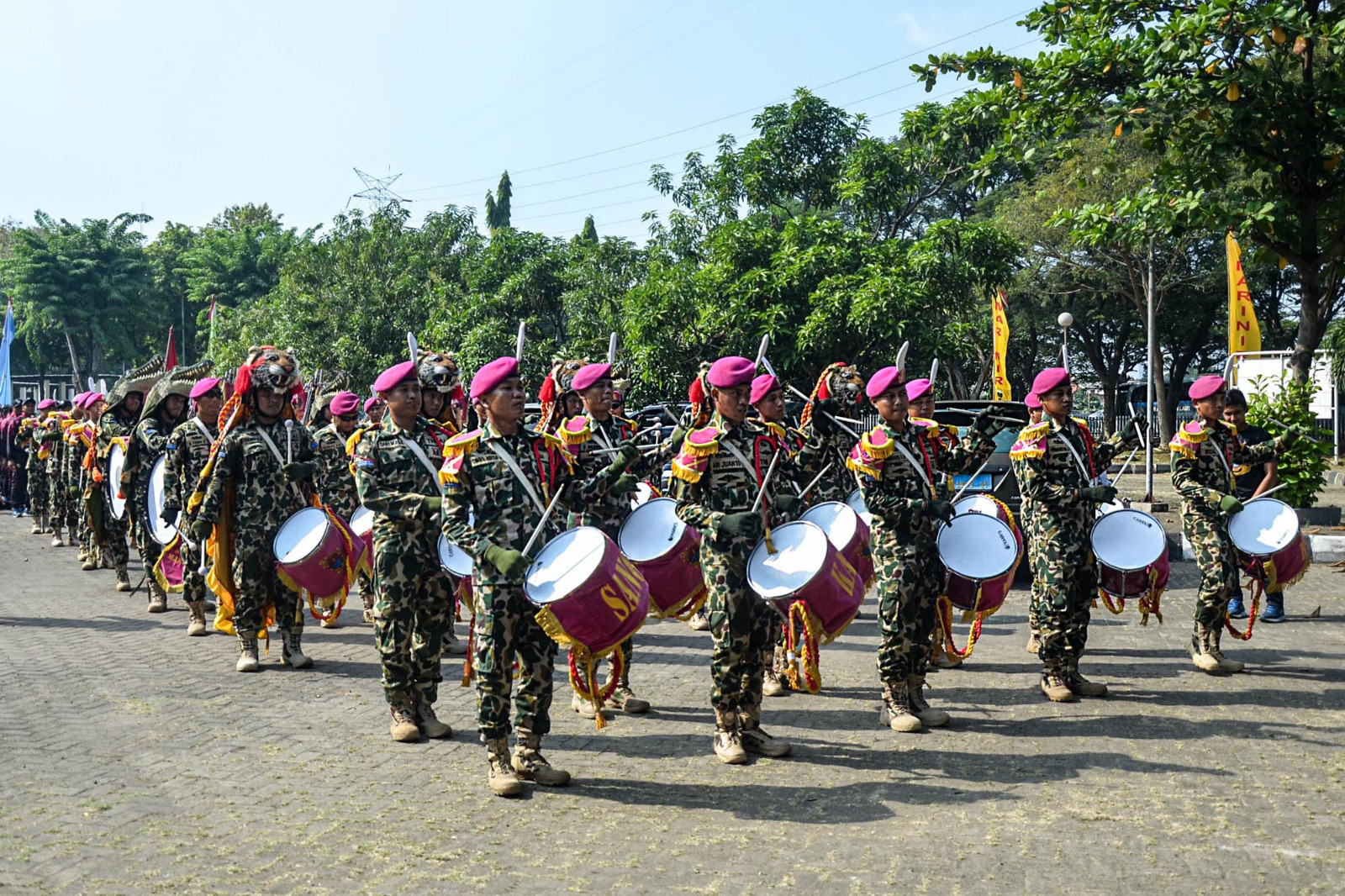 TNI AL, Dispen Kormar (Surabaya) Drumband Sangkala Yudha Perkasa mengiringi langkah atlet Marinir Wilayah Timur (Marwiltim) pada pembukaan Pekan Olahraga TNI AL Wilayah Timur (Poral Wiltim) tahun 2024 di Lapangan Jala Krida Mandala AAL, Bumimoro, Surabaya, Jawa Timur. Selasa (25/06/2024)
