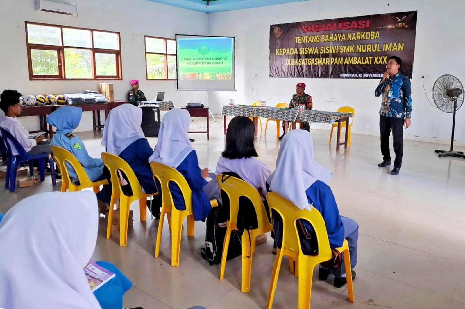 TNI AL, Dispen Kormar (Nunukan). Guna mencegah generasi muda tercemar dari penyalahgunaan Narkoba, Satgasmar Pam Ambalat XXX Bersama Badan Narkotika Nasional (BNN) mengadakan sosialisasi tentang Bahaya Narkoba kepada Siswa Siswi SMK Nurul Iman, Desa Tanjung Harapan, Sebatik, Nunukan, Kalimantan Utara. Selasa (12/11/2024).