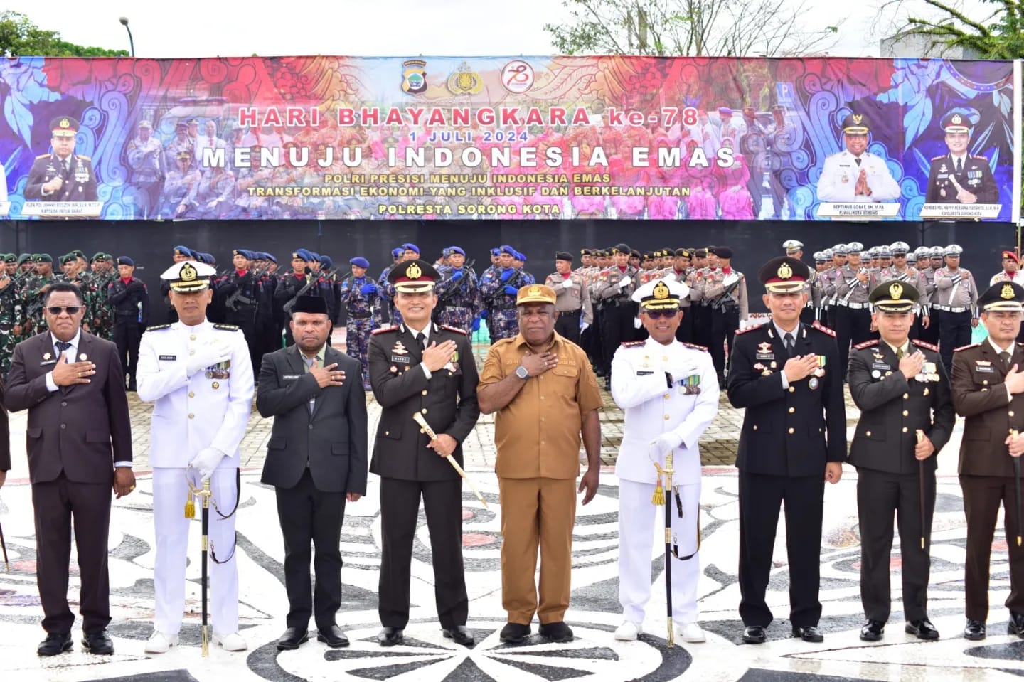 TNI AL, Dispen Kormar Sorong. Sinergitas TNI Prima dan Porli Presisi menuji Indonesia emas 2045, Wakil Komandan Pasmar 3 Kolonel David Candra Viasco, S.E., M.M., M.Sc., didampingi Wakil Ketua Korcab Jalasenastri Pasmar 3 Ny. Ratih David Candra Viasco menghadiri upacara peringatan Hari Ulang Tahun (HUT) Bhayangkara ke-78 bertempat di lapangan apel Kantor Walikota Sorong, Kel. Remu Utara, Distrik Sorong, Kota Sorong, Papua Barat Daya. Senin (01/07/2024).