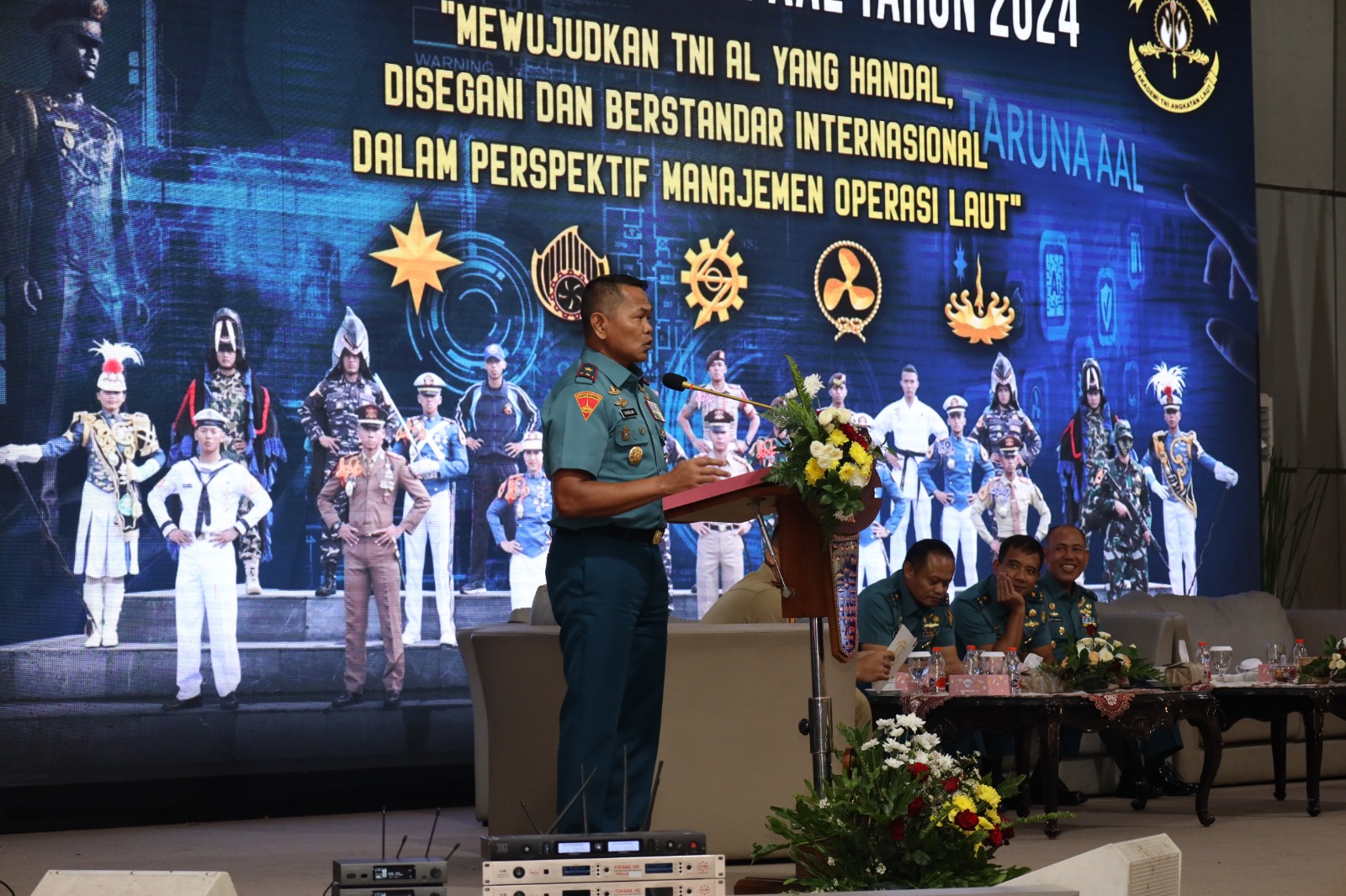 Dispen Kormar TNI Angkatan Laut (Surabaya). Komandan Korps Marinir (Dankormar) Mayjen TNI (Mar) Endi Supardi, S.E., M.M., M.Tr. Opsla., CHRMP., CRMP., diwakili Wakil Komandan Korps Marinir (Wadan Kormar) Brigjen TNI (Mar) Suherlan memberikan pembekalan kepada Taruna Akademi Angkatan Laut (AAL) Tingkat IV Angkatan ke-69 yang digelar di Gedung Maspardi, Kampus AAL, Bumimoro, Surabaya. Rabu (03/07/2024).